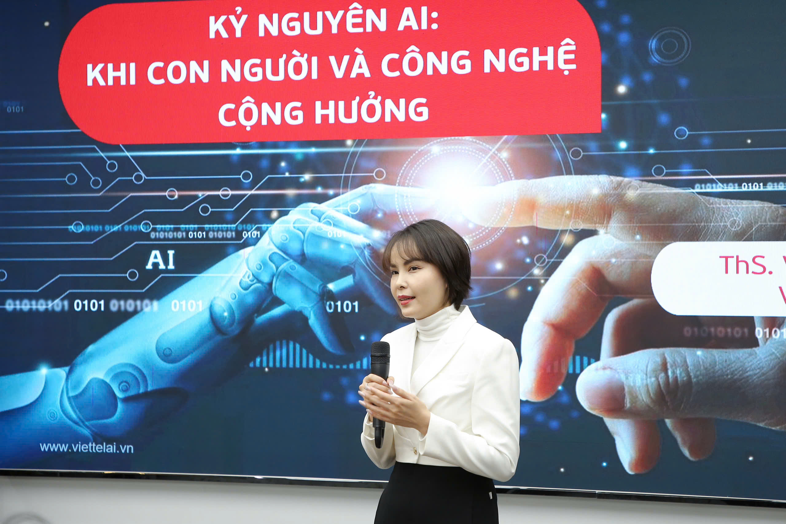 Trong khuôn khổ buổi lễ, các học viên và sinh viên còn được cung cấp các kiến thức, kỹ năng thực tế về công nghệ của lĩnh vực trí tuệ nhân tạo (AI) được trình bày bởi ThS khoa học Vũ Thị Hạnh – Chuyên gia tư vấn giải pháp AI, Trung tâm Dịch vụ dữ liệu và trí tuệ nhân tạo Viettel thông qua báo cáo: “Kỷ nguyên AI: Khi con người và công nghệ cộng hưởng”, với nội dung trao đổi về sự phát triển vượt bậc của AI trên thế giới trong những năm gần đây, những ứng dụng công nghệ AI tại Việt Nam cùng với các cơ hội nghề nghiệp tại Việt Nam nói chung và Viettel nói riêng.