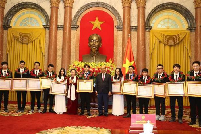Chủ tịch nước Nguyễn Xuân Phúc và nguyên Phó chủ tịch nước Nguyễn Thị Doan trao tặng Huân chương Lao động cho 19 học sinh có thành tích xuất sắc trong kỳ thi Olympic và Khoa học kỹ thuật quốc tế năm 2021 (ảnh: Bộ Giáo dục và Đào tạo)