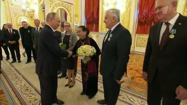 PGS.TS Nguyễn Tuyết Minh – cố vấn khoa học của Phòng đọc Thế giới Nga thuộc Khoa Quốc tế của ĐHQGHN là đại diện duy nhất của Việt Nam nhận Huy chương Puskin từ Tổng thống Nga Putin, tại Điện Kremlin, ngày 4/11/2017 (xem chi tiết tin).