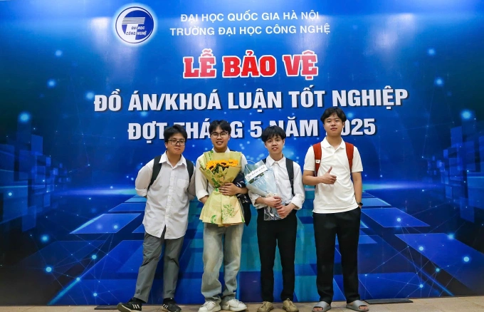 Vũ Minh Tiến (bìa trái) cùng các bạn bảo vệ đồ án tốt nghiệp sớm một năm, hồi tháng 5.