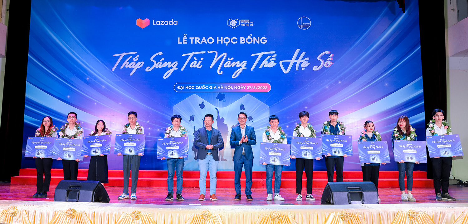Chiều ngày 27/3/2023, tại hội trường Nguyễn Văn Đạo, 30 sinh viên Trường Đại học Công nghệ (UET) đã vinh dự nhận học bổng “Thắp sáng tài năng thế hệ số” do Ban Thường vụ Đoàn Đại học Quốc gia Hà Nội phối hợp cùng Công ty TNHH Recess (Lazada) trao tặng