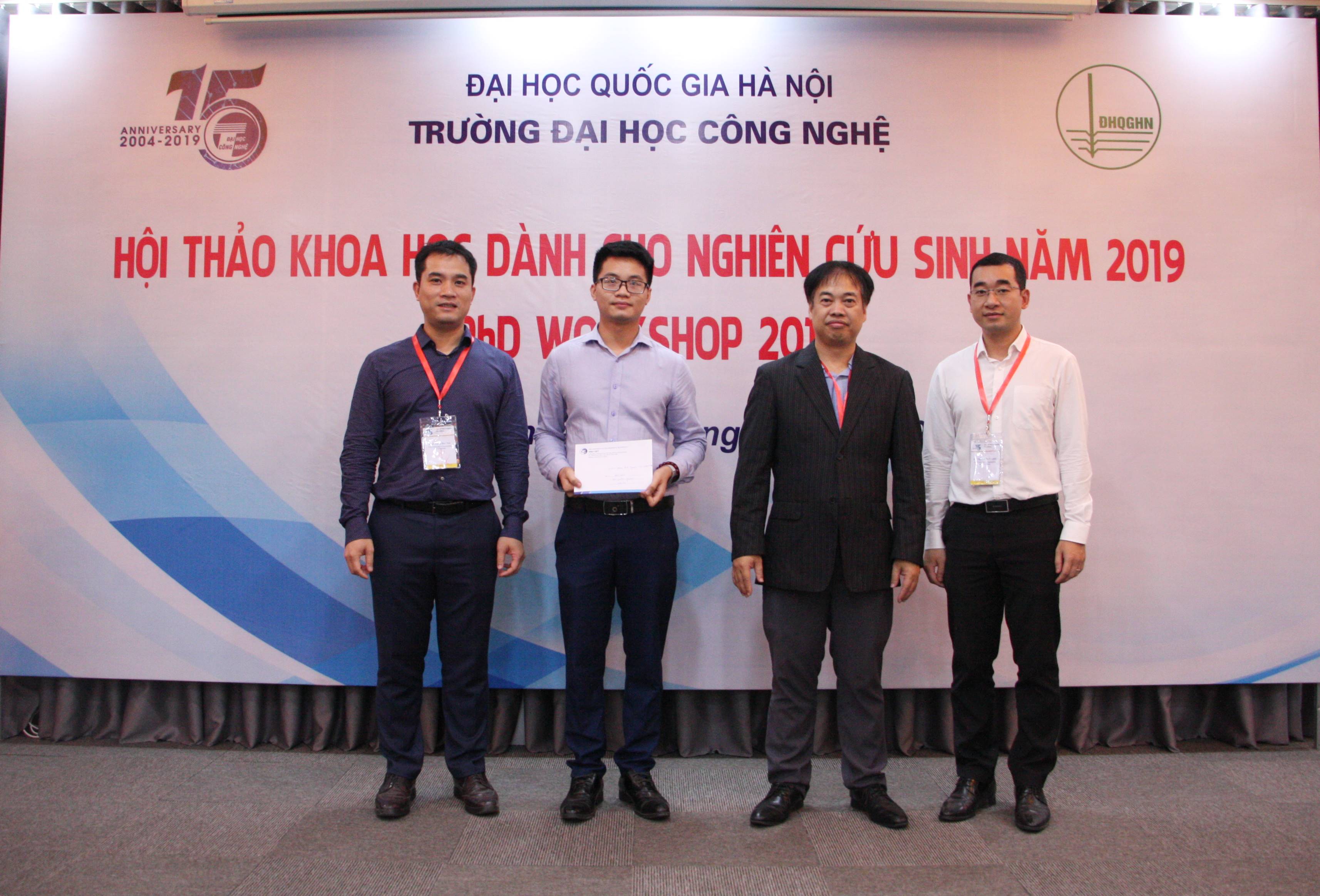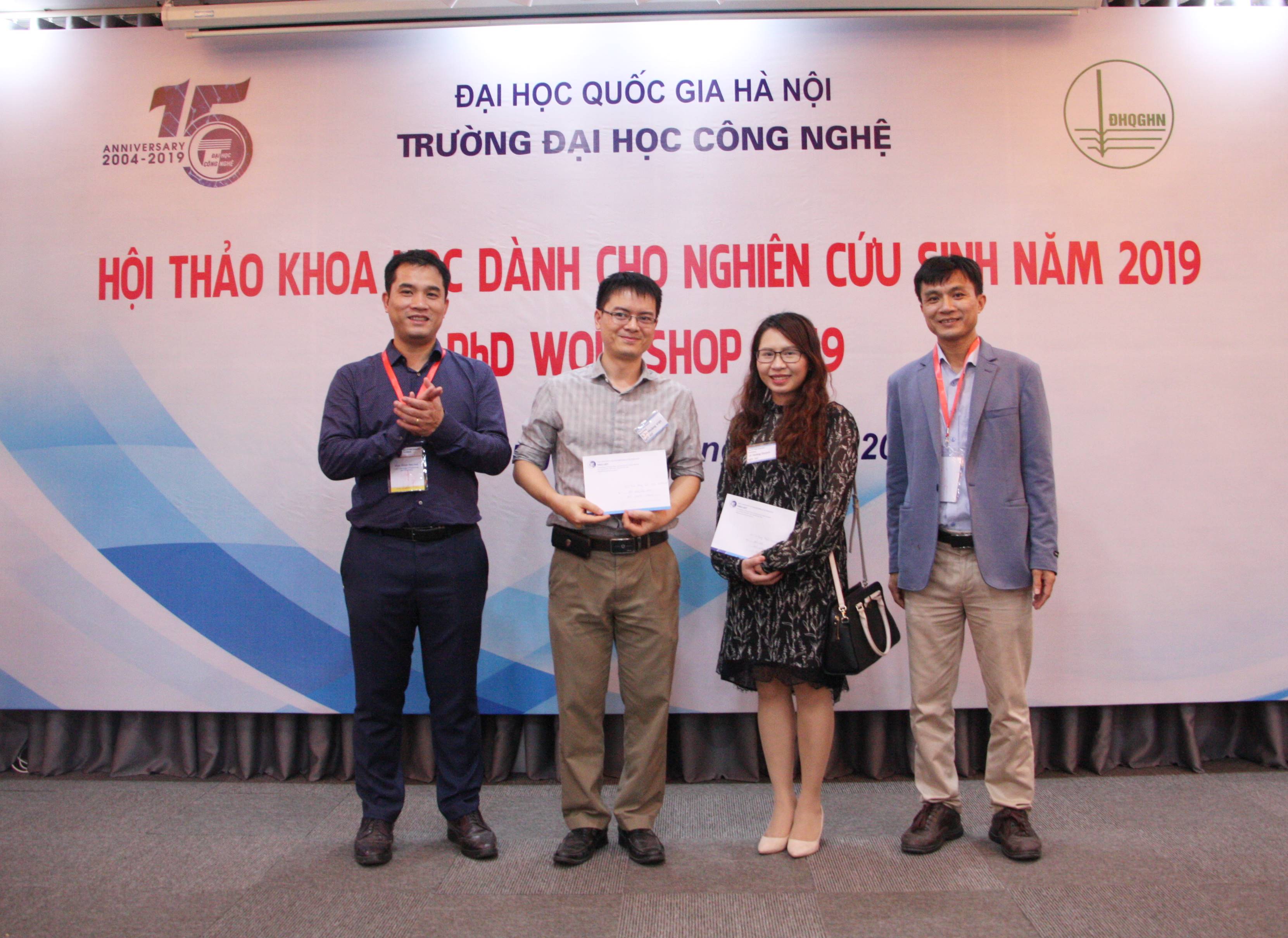 Kết thúc, hội thảo đã chọn ra 04 đề tài xuất sắc để trao thưởng, cụ thể khoa CNTT có các poster của NCS Lê Hoàng Quỳnh với đề tài “A richer – but – smarter  shortest dependency path with attentive augmentation for ralation extraction” và NCS Trần Hoàng Việt với đề tài “On locally minimum and strongest assumption generation method for component-based software verification”;khoa ĐTVT có poster của NCS Phí Công Huy với đề tài “A low complexity Wyner-Ziv coding based light field image compression”; khoa VLKT&CNNN có poster của NCS Nguyễn Thị Khánh Vân với đề tài “Effect of annealing temperature on the microstructure of TiO2 nanoparticles prepared by electrochemical method”; khoa CHKT&TĐH cóposter của NCS Phạm Đình Nguyện với đề tài “An analytical approach on nonlinear mechanical and thermal post-bukling of nanocomposite double-curved shallow shells reinforced by carbon nanotubes”.