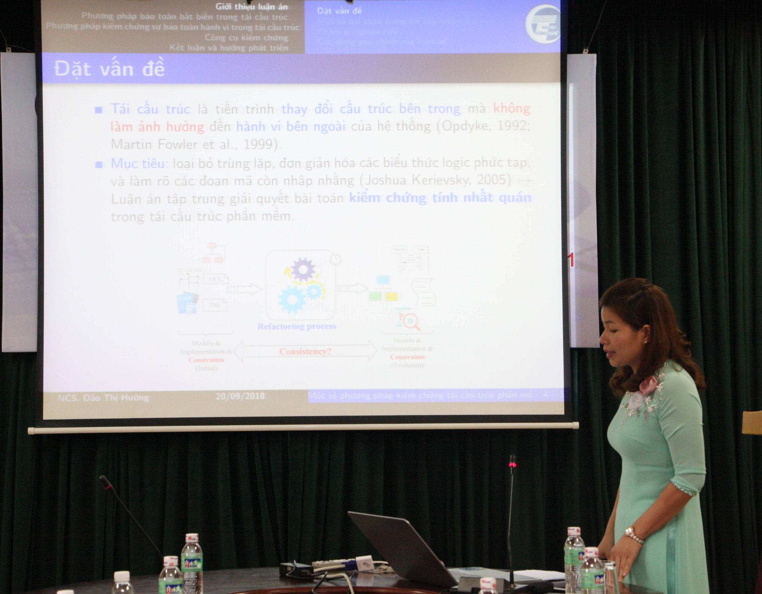 Tại lễ bảo vệ, NCS Đào Thị Hường đã trình bày lý thuyết và kết quả nghiên cứu của luận án. Kết quả đạt được của luận án tập trung vào nội dung đề xuất phương pháp mô hình hóa hệ thống hướng đối tượng bằng UML; đề xuất phương pháp mô hình hóa và kiểm chứng sự bảo toàn hành vi của hệ thống phần mềm sau quá trình tái cấu trúc, tại các giai đoạn thiết kế và cài đặt hệ thống phần mềm có sử dụng mẫu thiết kế; xây dựng và thử nghiệm thành công cụ kiểm chứng CVT.