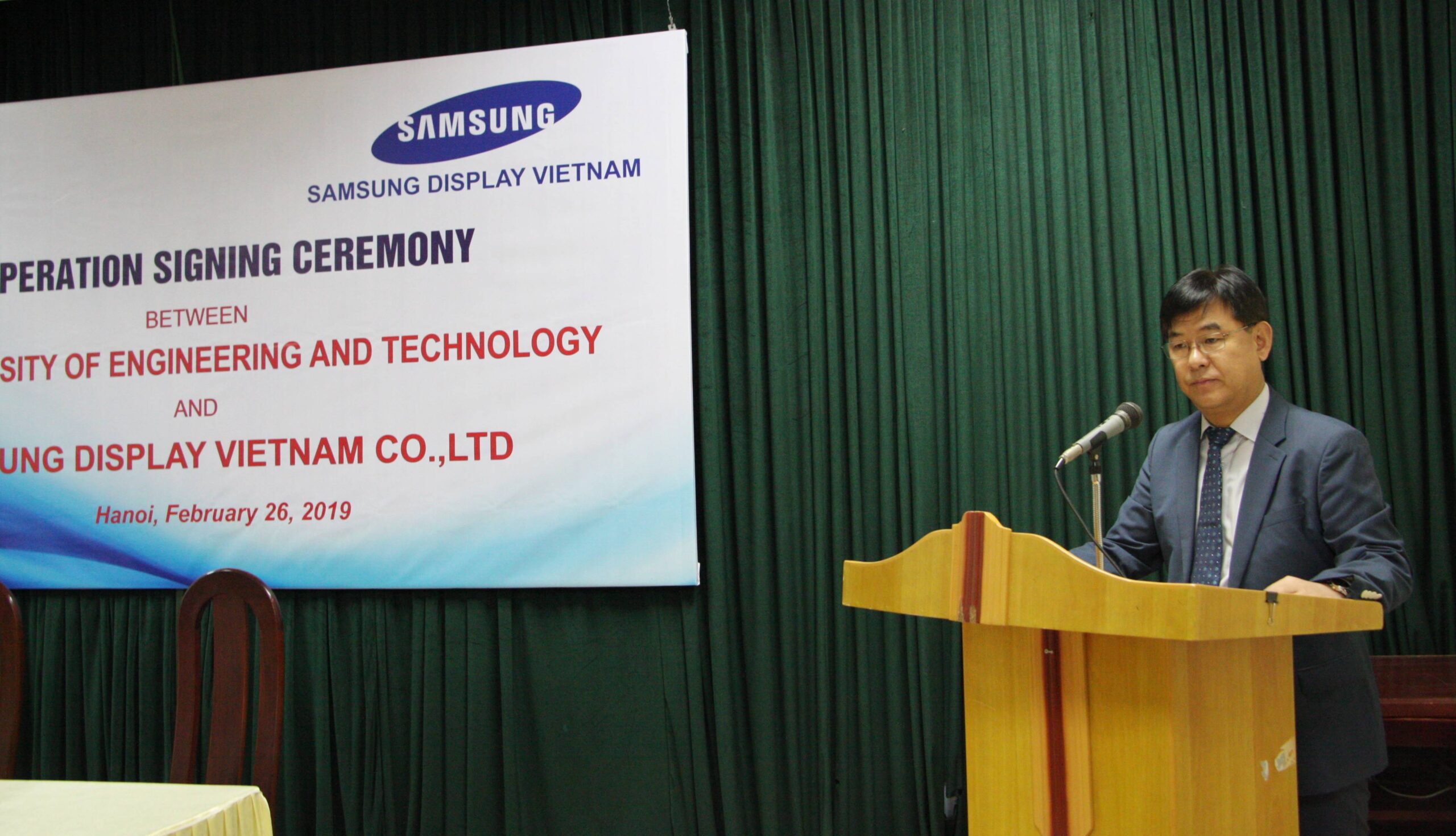 Phát biểu tại buổi lễ, PGS.TS Nguyễn Việt Hà gửi lời chúc mừng sự phát triển không ngừng của Công ty Samsung Display Việt Nam nói riêng và Tập đoàn Samsung nói chung. Có thể nói Samsung trở thành thương hiệu công nghệ số một, đồng thời có đóng góp đặc biệt vào sự phát triển kinh tế, xã hội Việt Nam. Trường ĐHCN luôn mong muốn hợp tác chặt chẽ với các tập đoàn, doanh nghiệp công nghệ cao để nâng cao chất lượng đào tạo, nghiên cứu và phát triển các cơ hội nghề nghiệp của sinh viên. Vì vậy, trong những năm qua, Nhà trường đã triển khai hợp tác với Trung tâm Nghiên cứu và Phát triển điện thoại di động Samsung Việt Nam trong lĩnh vực đào tạo, tuyển dụng. Còn đối với Công ty SDV, Nhà trường đã triển khai những hợp tác đào tạo ngắn hạn, công tác việc làm của sinh viên. Lễ ký kết ngày hôm nay đã khẳng định sự hiệu quả, lợi ích bền vững về các hoạt động hợp tác của hai bên, đồng thời là căn cứ động lực để hai bên triển khai hợp tác sắp tới hiệu quả hơn.