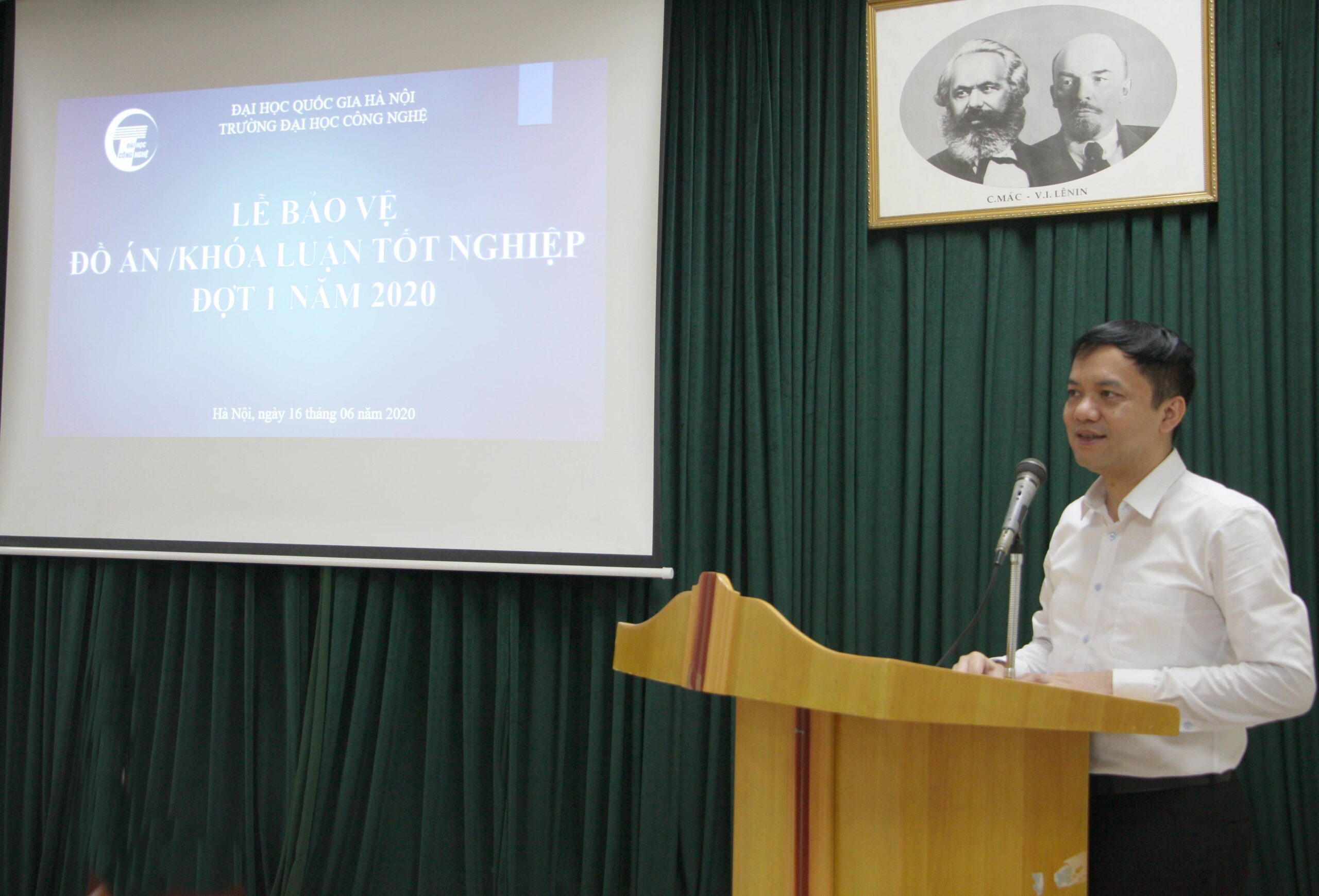 Sáng ngày 16/06/2020, Trường Đại học Công nghệ (ĐHCN), Đại học Quốc gia Hà Nội (ĐHQGHN) đã diễn ra buổi khai mạc Lễ bảo vệ đồ án/khóa luận tốt nghiệp đại học đợt 1 năm 2020.