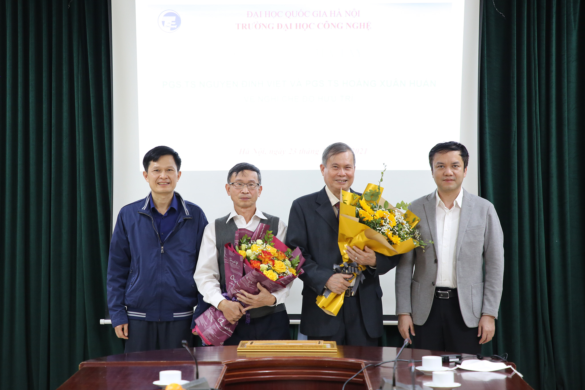 Ngày 23/12/2021, Trường Đại học Công nghệ (ĐHCN) – Đại học Quốc gia Hà Nội tổ chức buổi gặp mặt thân mật chia tay PGS.TS. Hoàng Xuân Huấn – Giảng viên cao cấp, khoa Công nghệ thông tin; nguyên Phó chủ nhiệm Bộ môn và PGS.TS. Nguyễn Đình Việt – Giảng viên cao cấp, khoa Công nghệ thông tin; nguyên Trưởng phòng Tổ chức cán bộ và Công tác sinh viên; nguyên Trưởng ban Thanh tra, kiêm Trưởng phòng thí nghiệm Hệ thống Nhúng Trường ĐHCN về nghỉ hưu hưởng chế độ Bảo hiểm xã hội sau gần 50 năm công tác.