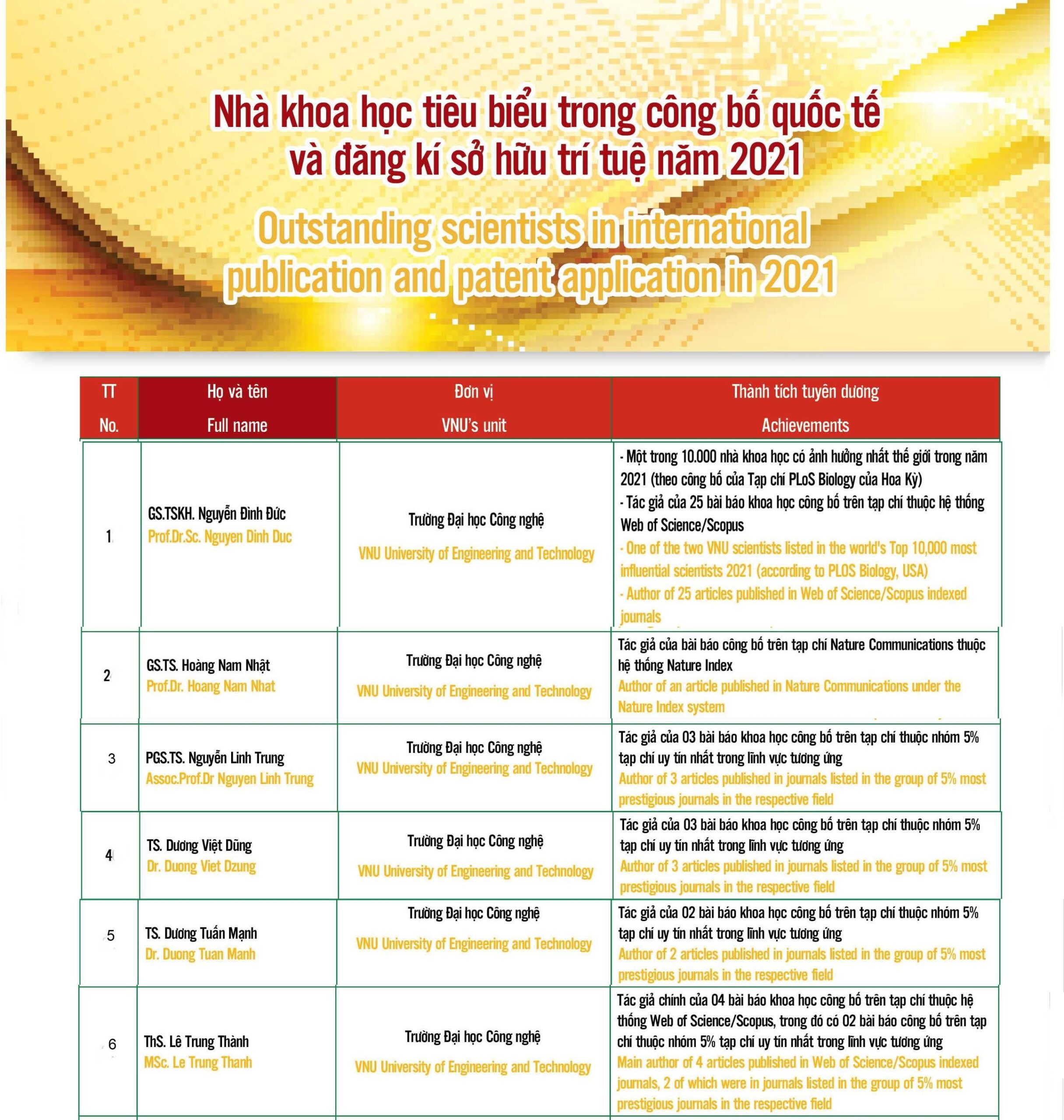 Nhiều nhà khoa học của Trường Đại học Công nghệ được ĐHQGHN vinh danh với những thành tích xuất sắc trong nghiên cứu và công bố quốc tế 2021