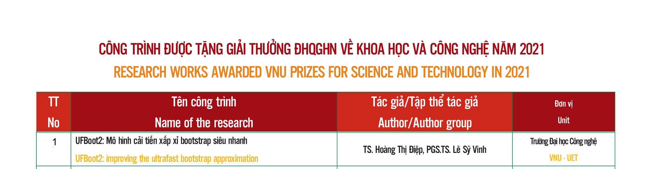 Theo đó, Giải thưởng ĐHQGHN về khoa học và công nghệ năm 2021 đã được trao cho PGS.TS Lê Sỹ Vinh, TS. Hoàng Thị Điệp với công trình “UFBoot2: improving the ultrafast bootstrap approximation” đạt giải, trị giá 50.000.000 đồng/công trình.