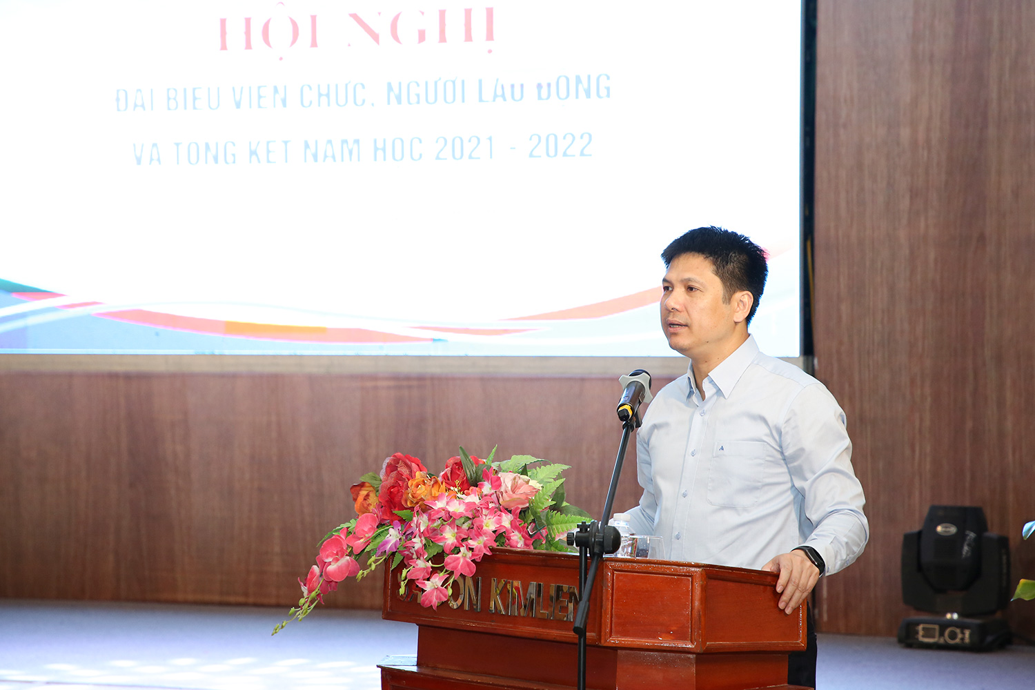 Tại Hội nghị, Phó Hiệu trưởng Nguyễn Anh Thái báo cáo Dự thảo tổng kết năm học 2021-2022 và kế hoạch nhiệm vụ trọng tâm năm học 2022-2023.
