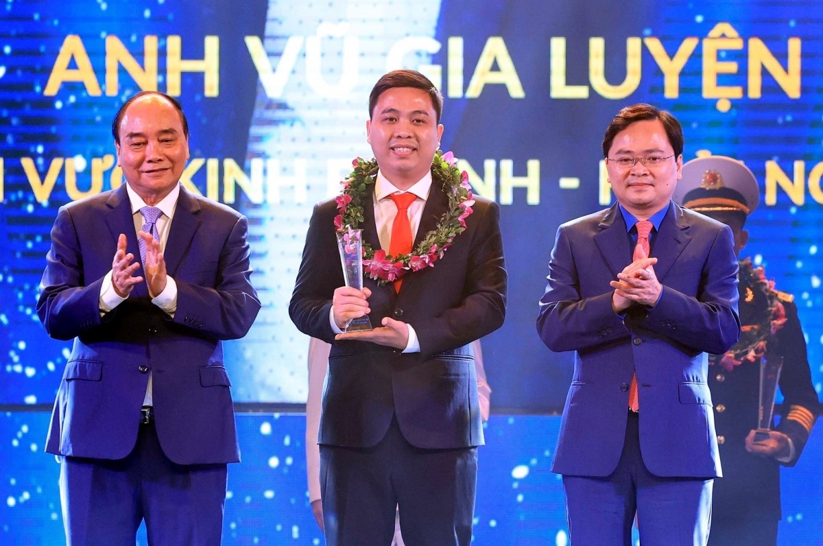Chủ tịch nước Nguyễn Xuân Phúc và Bí thư thứ nhất T.Ư Đoàn Nguyễn Anh Tuấn trao tặng giải thưởng Gương mặt trẻ tiêu biểu 2021 cho CEO Vũ Gia Luyện.