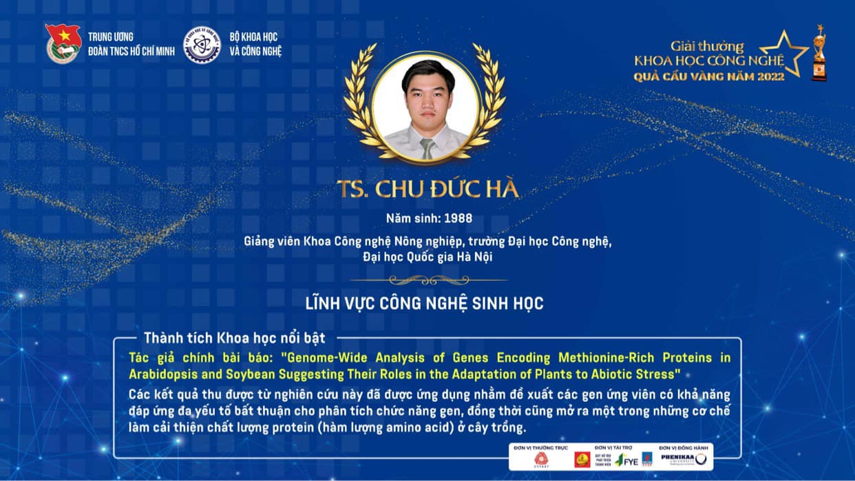 Từ 37 ứng viên xuất sắc xét chọn giải thưởng gửi hồ sơ tham dự, Trung ương Đoàn TNCS Hồ Chí Minh và Bộ Khoa học và Công nghệ đã lựa chọn 10 gương mặt tài năng trẻ để trao giải thưởng Quả cầu vàng 2022. Trong đó, Trường Đại học Công nghệ – Đại học Quốc gia Hà Nội vinh dự có TS. Chu Đức Hà – Giảng viên Khoa Công nghệ nông nghiệp là 01 cá nhân trong tổng số 10 cá nhân được nhận Giải thưởng này.