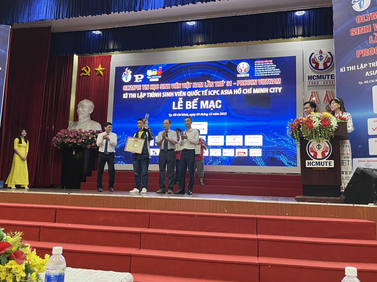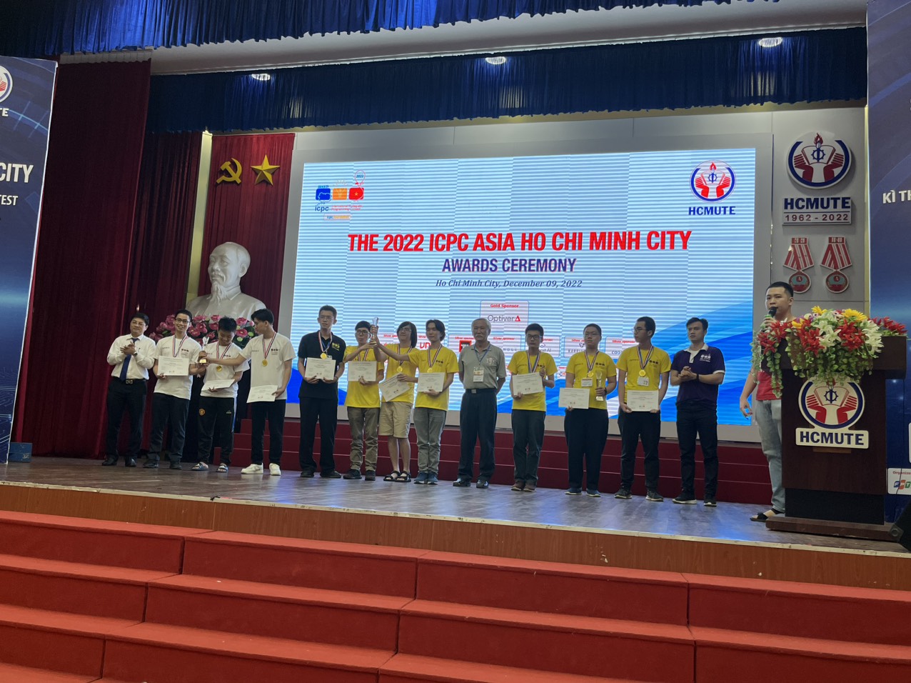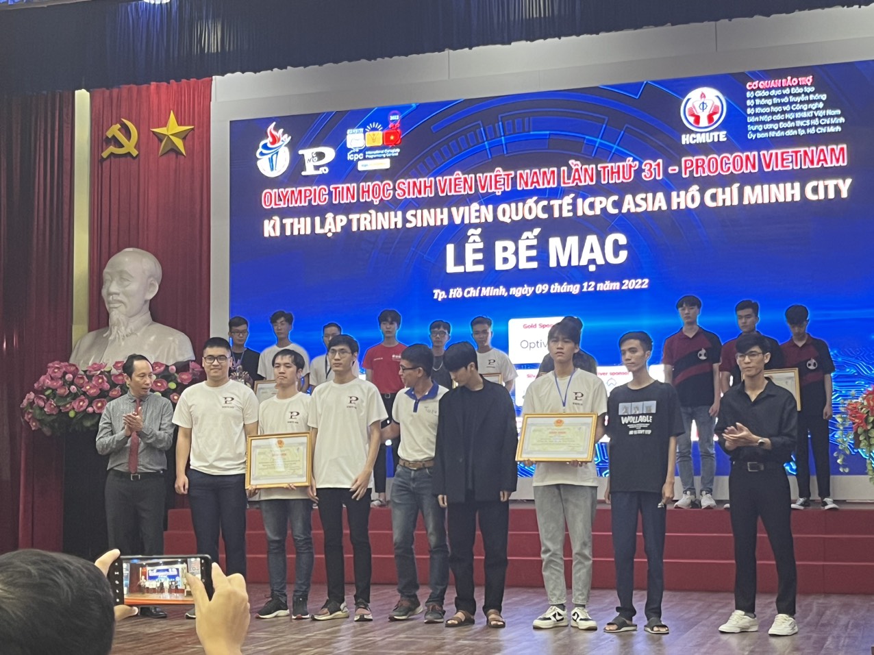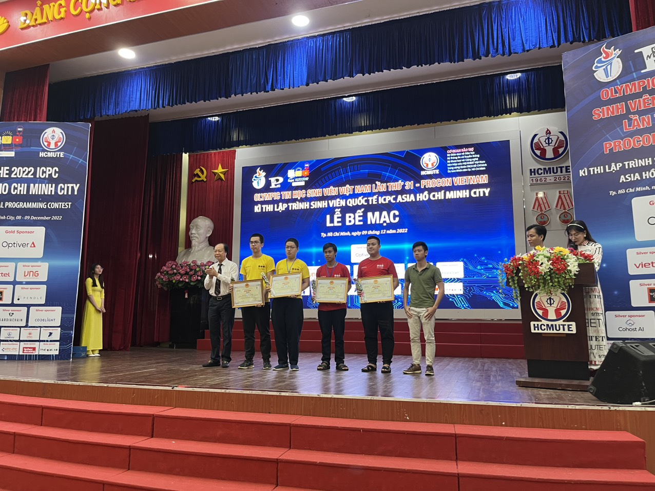Vừa qua, tại Trường Đại học Sư phạm Kỹ thuật TPHCM đã diễn ra Lễ bế mạc Kỳ thi Olympic Tin học sinh viên Việt Nam lần thứ 31 (OLP’22) – Procon VietNam và Kỳ thi Lập trình sinh viên quốc tế ICPC Asia Hochiminh City, đội tuyển sinh viên Trường Đại học Công nghệ – Đại học Quốc gia Hà Nội đã giành 01 Cúp Vàng, 01 Cúp Đồng, giải Ba kỳ thi Olympic Tin học sinh viên Việt Nam, giải Nhất kỳ thi ICPC Asia Hochiminh City và đạt giải Nhì kỳ thi Procon Việt Nam.