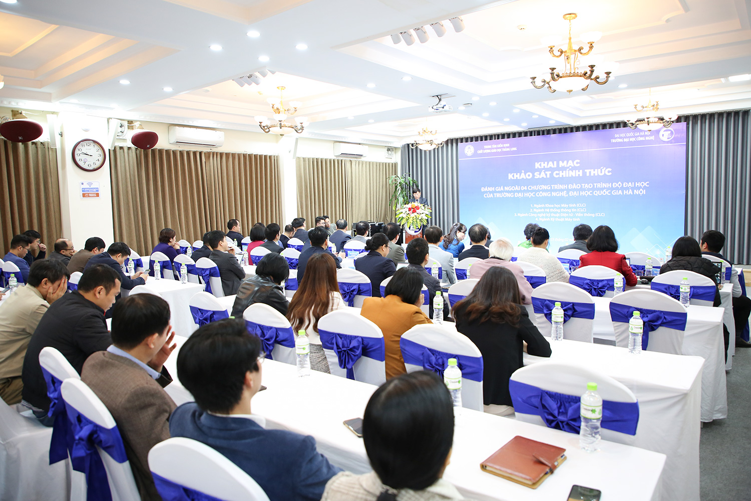 Tham dự phiên khai mạc về phía ĐHQGHN có PGS.TS. Nguyễn Anh Tuấn – Phó Trưởng ban Đào tạo, TS. Bùi Vũ Anh – Phó Viện trưởng Viện Đảm bảo chất lượng giáo dục, TS. Nguyễn Minh Trường – Phó Trưởng ban Chính trị và công tác HSSV, ThS. Nguyễn Văn Thắng – Phó Giám đốc Trung tâm Hỗ trợ sinh viên. Về phía Trường ĐH Công nghệ có GS.TS Nguyễn Hữu Đức – Nguyên Phó Giám đốc ĐHQGHN, Nguyên Hiệu trưởng, Chủ tịch Hội đồng Khoa học và đào tạo Trường; PGS.TS. Nguyễn Việt Hà – Bí thư Đảng uỷ, Hiệu trưởng; GS.TS. Chử Đức Trình – Phó Hiệu trưởng; TS. Nguyễn Anh Thái – Phó Hiệu trưởng; TS. Nguyễn Thu Hương – Phó Hiệu trưởng cùng lãnh đạo các khoa, phòng ban, trung tâm cùng các thành viên Hội đồng Tự đánh giá.