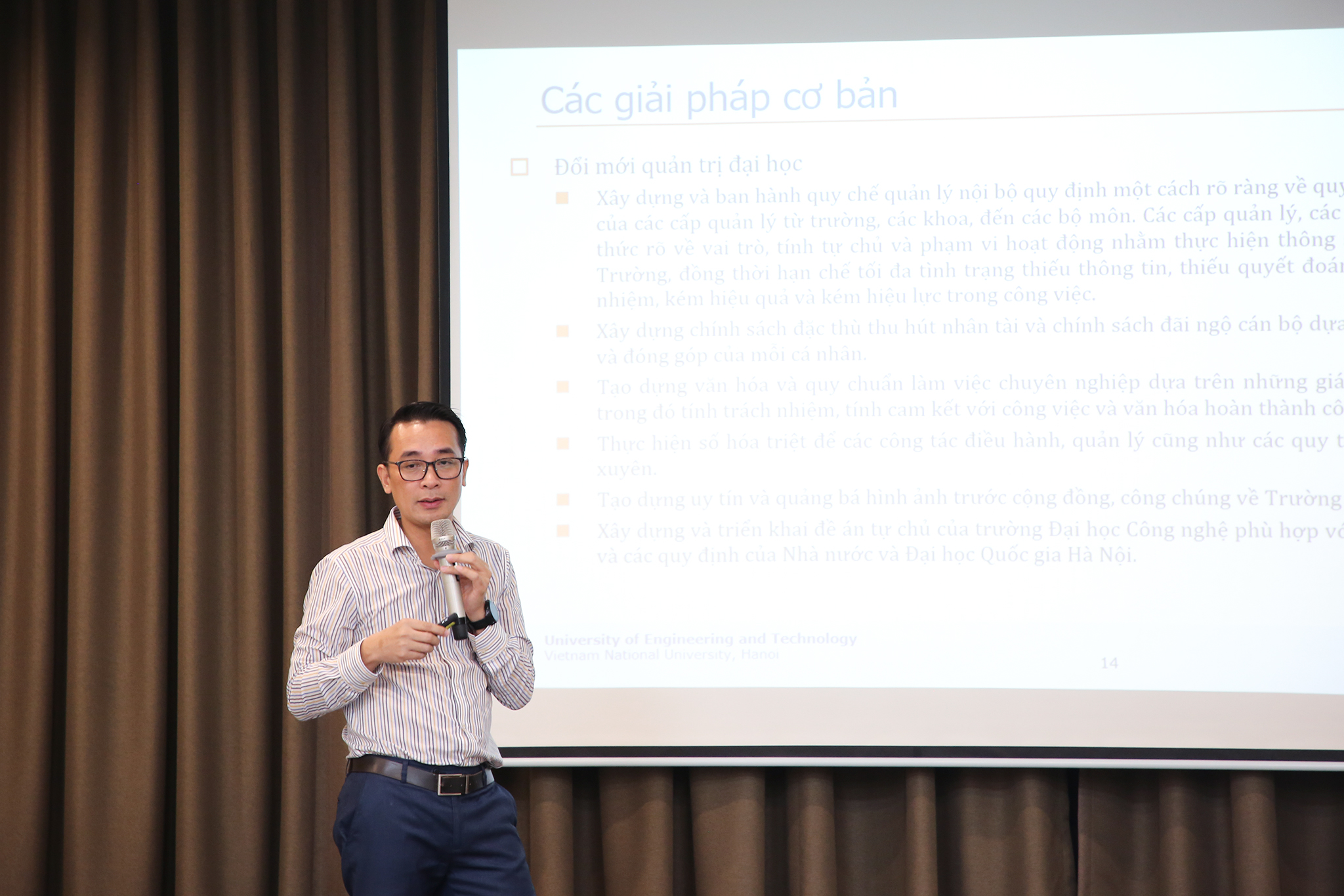 GS.TS Chử Đức Trình – Hiệu trưởng Nhà trường trình bày Dự thảo Chiến lược phát triển Trường Đại học Công nghệ đến năm 2030, tầm nhìn 2045, Dự thảo Đề án Đối mới cơ chế hoạt động của Trường Đại học Công nghệ, báo cáo tình hình thực hiện nhiệm vụ năm học 2022-2023, kế hoạch nhiệm vụ năm học 2023-2024 của Trường Đại học Công nghệ và việc mở ngành Thiết kế công nghiệp và đồ hoạ.