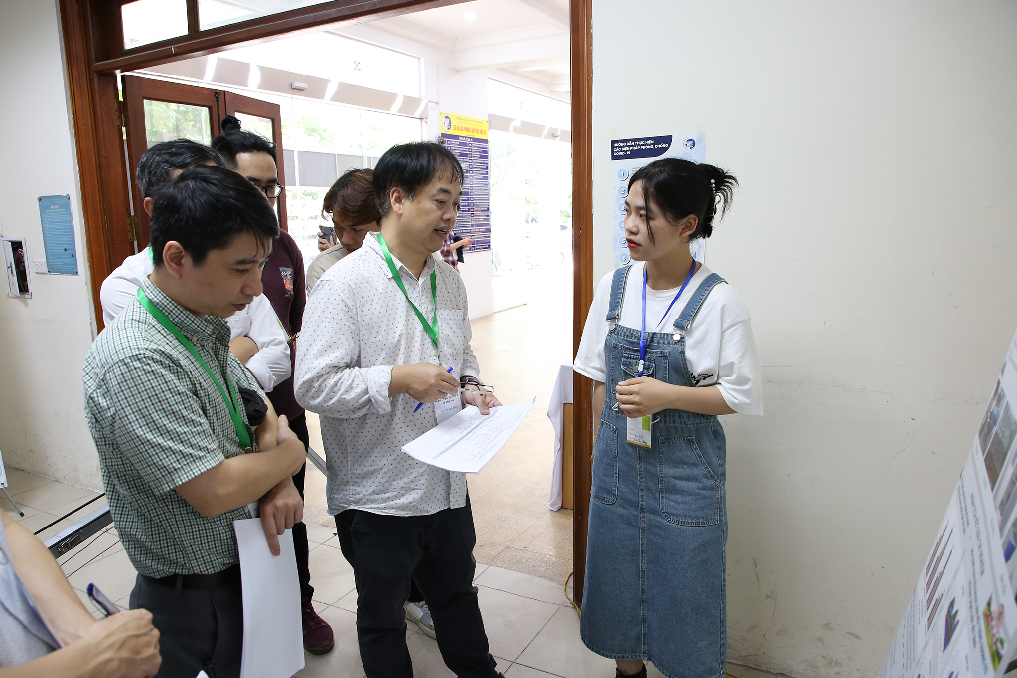 TS. Hoàng Vũ Chung – Giám đốc Công ty TNHH Nano Lam Sơn (ngoài cùng, bên trái ảnh) ấn tượng với các đề tài, sản phẩm khoa cùng sự đam mê nghiên cứu của sinh viên UET