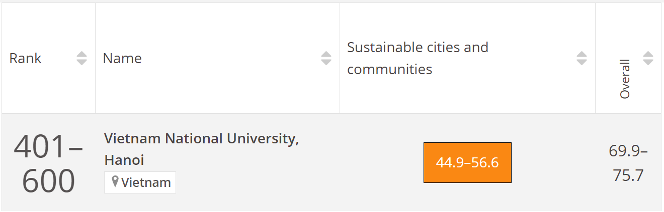 Việc được xếp hạng top 401-600 ở SDG 11 – Thành phố và cộng đồng bền vững (Sustainable cities and communities) thể hiện vai trò gắn kết môi trường giáo dục đại học với cộng đồng xã hội, khẳng định ĐHQGHN xây dựng một môi trường học thuật tiên tiến nhưng cũng rất gần gũi, thân thiện. Triết lý này cũng là một định hướng quan trọng để ĐHQGHN quy hoạch, xây dựng và phát triển Khu đô thị ĐHQGHN tại Hòa Lạc.