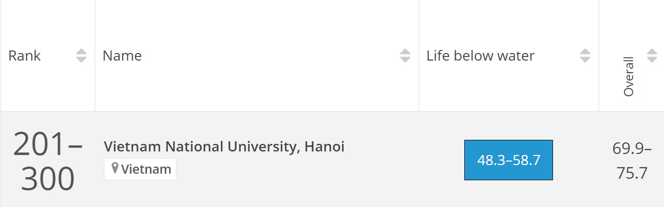 Ngoài ra, với thế mạnh từ lĩnh vực nghiên cứu liên quan tới tài nguyên và môi trường nói chung và dưới nước, mặt đất nói riêng, ĐHQGHN cũng đã được xếp hạng trong top 201-300 ở SDG 14 – Tài nguyên và môi trường nước (Life Below Water). Kết quả này cũng đã thể hiện vai trò và giải trình sự đóng góp của ĐHQGHN với cộng đồng về việc phát triển tài nguyên và môi trường dưới nước một cách bền vững.