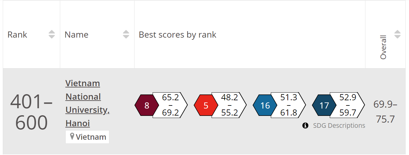 – SDG 17: Hợp tác để hiện thực hoá các mục tiêu (Partnership for the goals): thuộc nhóm 801-1000 trong tổng số 2031 cơ sở giáo dục tham gia xếp hạng.