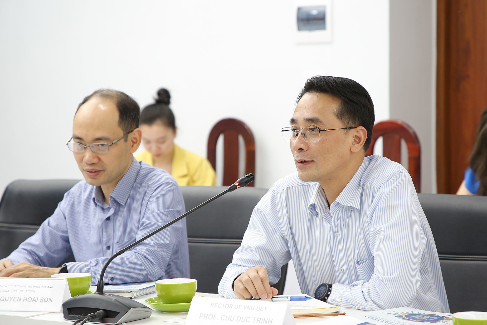 Tham dự tiếp đoàn về phía ĐHQGHN có TS. Nguyễn Trung Hiển – Phó Trưởng ban Hợp tác phát triển. Về phía Trường ĐH Công nghệ có GS.TS Chử Đức Trình – Hiệu trưởng Nhà trường cùng lãnh đạo phòng KHCN&HTPT, khoa Điện tử viễn thông và khoa Vật lý kỹ thuật và công nghệ nano.
