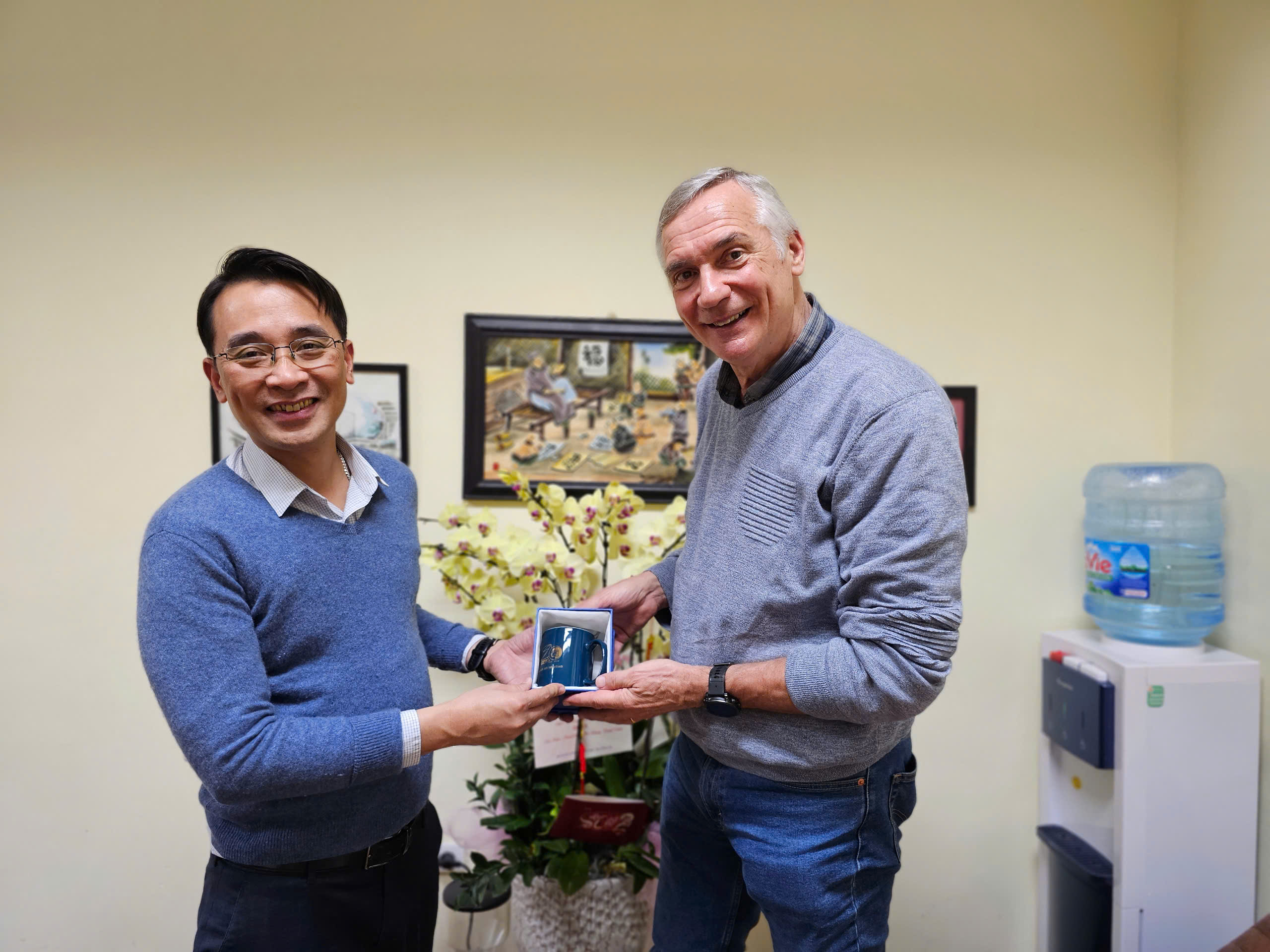 GS.TS Chử Đức Trình – Hiệu trưởng Trường ĐH Công nghệ (bên trái ảnh) đón tiếp ông Tom Aarnink, Kỹ sư trưởng tại Phòng thí nghiệm Nano thuộc Đại học Kỹ thuật Twente, Hà Lan