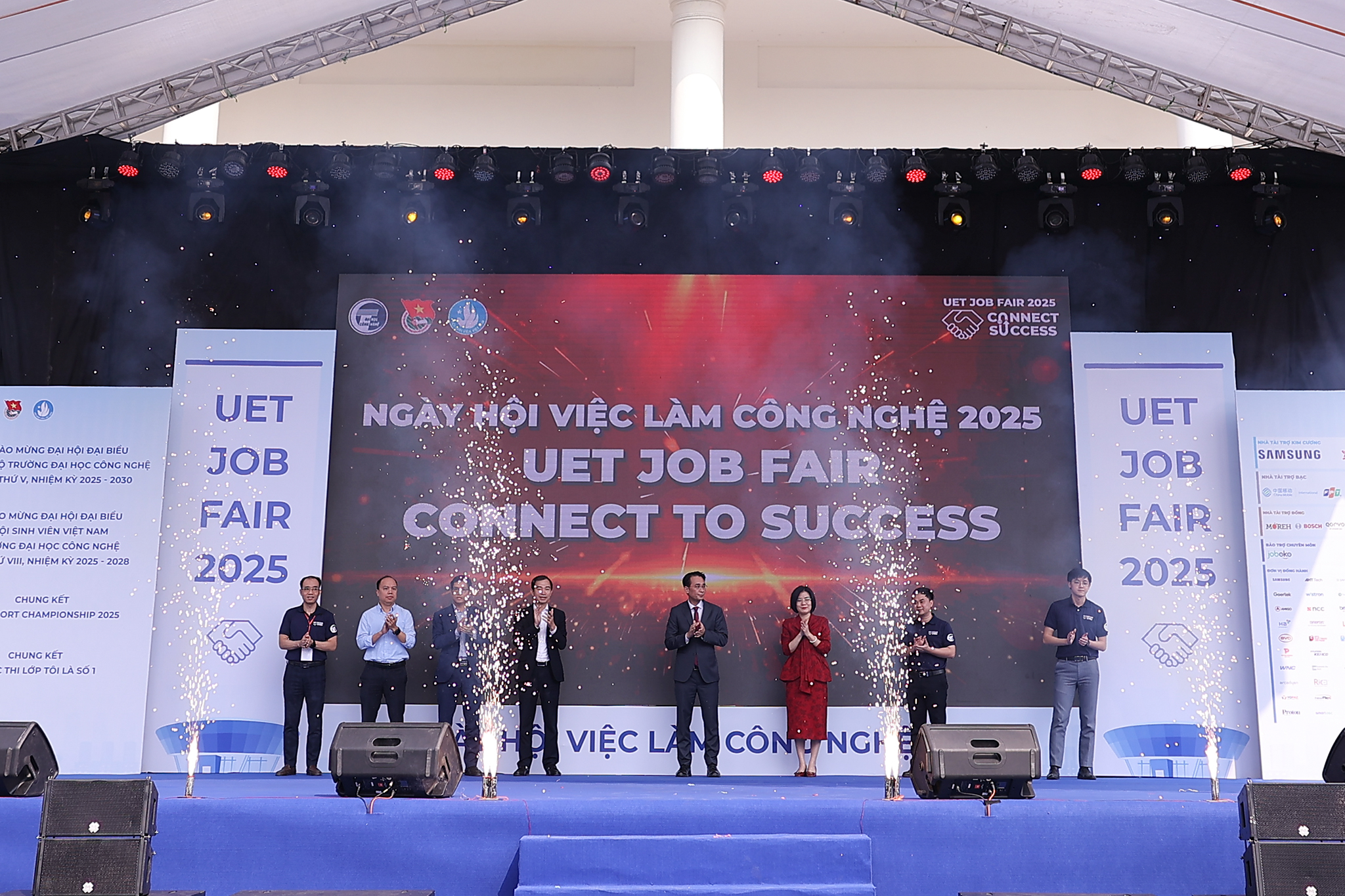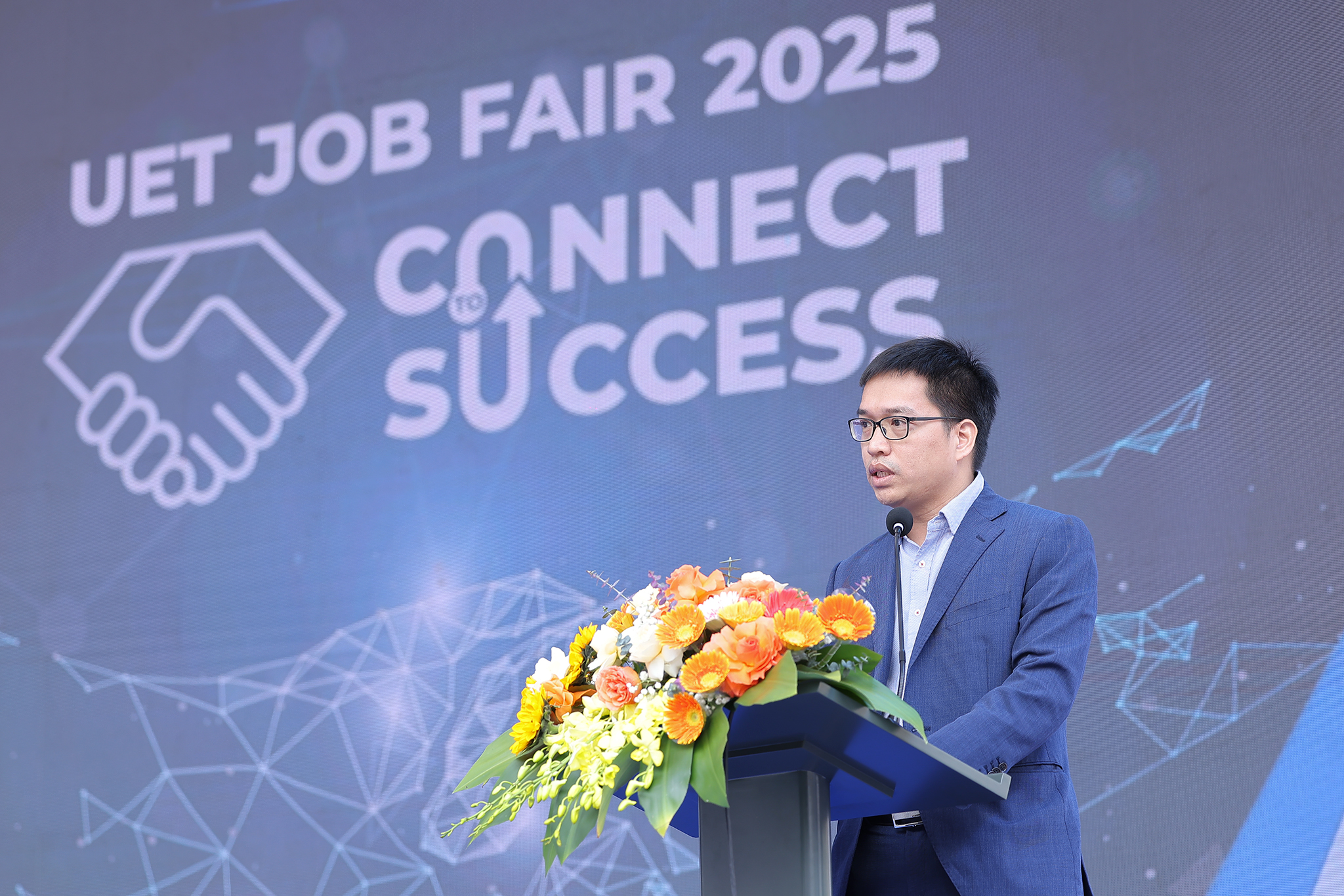 Hiệu trưởng cũng nhấn mạnh: “UET Jobfair 2025 là Ngày hội lớn của sinh viên toàn khối ngành công nghệ và kỹ thuật trên địa bàn thành phố Hà Nội. Ngày hội là dịp để các em tìm hiểu về thị trường lao động qua việc lắng nghe, tiếp xúc và tìm hiểu sâu hơn những nhu cầu của các nhà tuyển dụng, các em biết mình đã chuẩn bị được gì, còn thiếu những gì, từ đó trau dồi và định hướng cho mình con đường nghề nghiệp trong tương lai. Sớm hoàn thành chương trình đào tạo đúng thời hạn. Luôn có ý thức, trách nhiệm với bản thân, gia đình, và xã hội, lan toả giá trị cốt lõi, giá trị nhân văn của Trường ĐH Công nghệ đến với các thế hệ mai sau”.