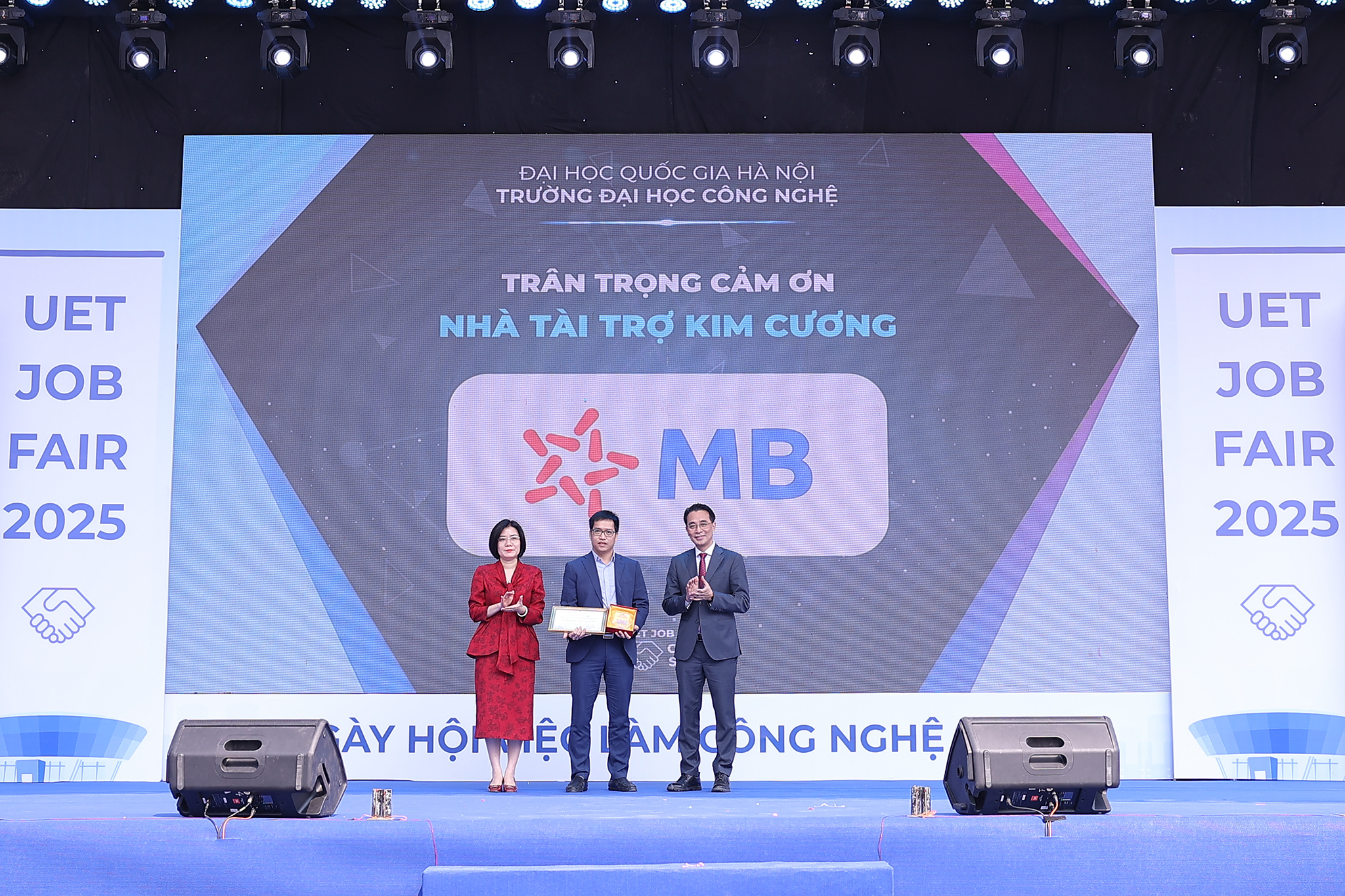 Ban Giám hiệu Trường ĐH Công nghệ trao kỷ niệm chương và giấy chứng nhận cho đại diện Nhà tài trợ Kim Cương – Ngân hàng thương mại Cổ phần Quân đội (MB Bank)