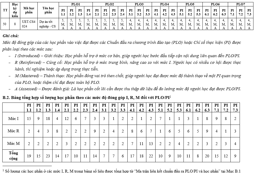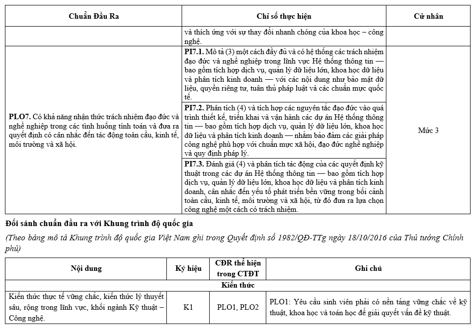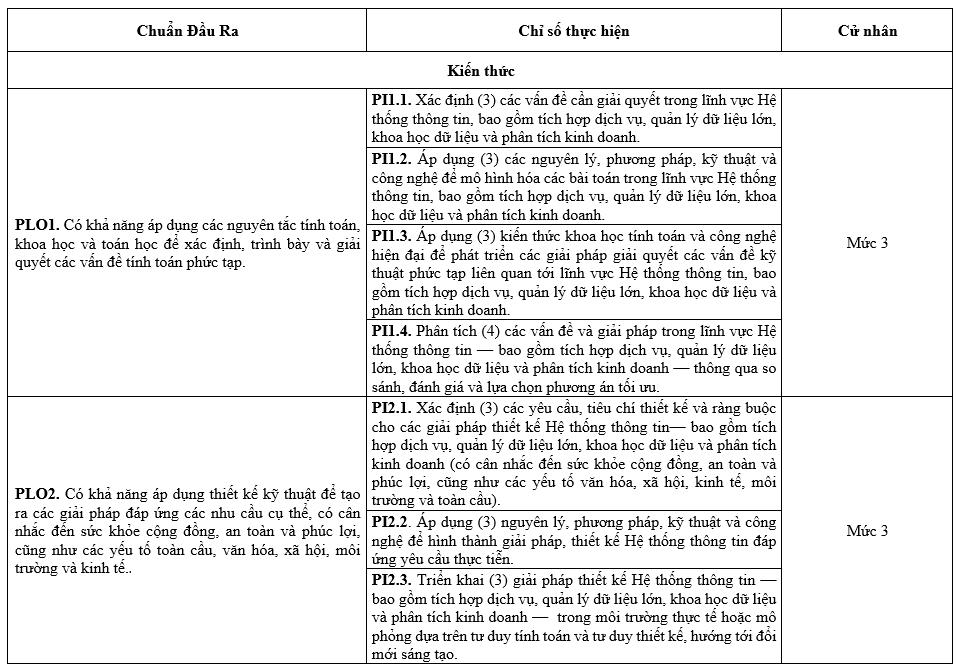 Các Chuẩn đầu ra (CĐR) của Chương trình đào tạo (CTĐT) bao gồm CĐR kiến thức, CĐR kỹ năng và CĐR mức tự chủ và trách nhiệm. CĐR bao gồm các mục (1) đến (7) như sau: