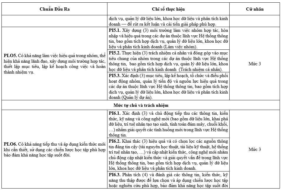 | PLO6 | Có khả năng tiếp thu và áp dụng kiến thức mới khi cần thiết, sử dụng các chiến lược học tập phù hợp bảo đảm khả năng học tập suốt đời. | x | ||