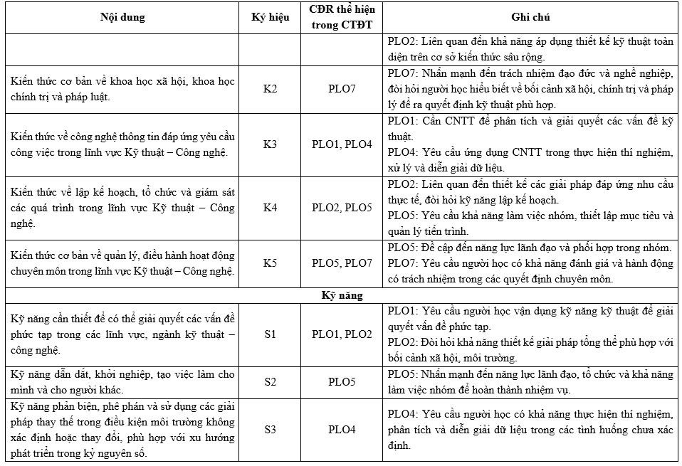 | PLO2 | Có khả năng áp dụng thiết kế kỹ thuật để tạo ra các giải pháp đáp ứng các nhu cầu cụ thể, có cân nhắc đến sức khỏe cộng đồng, an toàn và phúc lợi, cũng như các yếu tố toàn cầu, văn hóa, xã hội, môi trường và kinh tế. | x | x | |