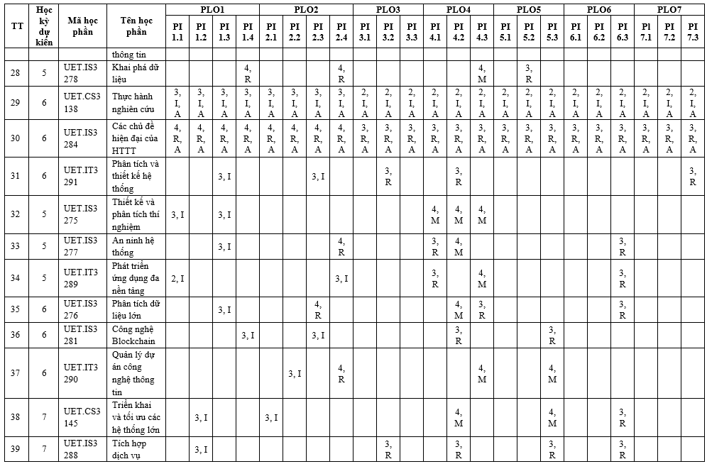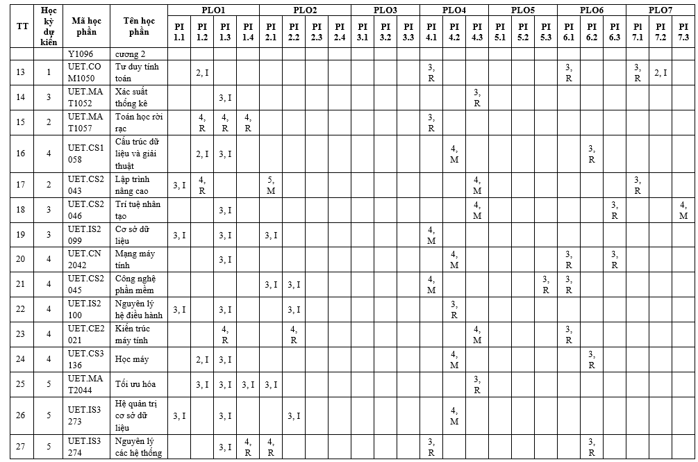 | Mã PLO | Nội dung chuẩn đầu ra | Đối sánh với mục tiêu đào tạo cụ thể | ||