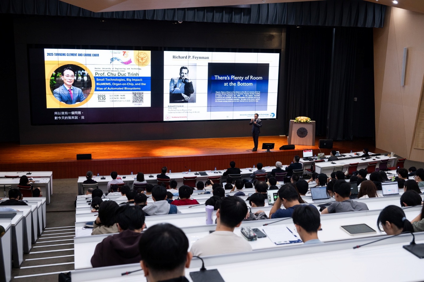 Bài giảng của GS. TS. Chử Đức Trình đã thu hút đông đảo giảng viên và sinh viên, bao gồm nhiều các sinh viên quốc tế, đang theo học tại các khoa Cơ khí, Công nghệ thông tin, Kỹ thuật môi trường và Khoa học máy tính của Đại học Tamkang tham dự. Phần hỏi đáp kéo dài hơn 40 phút với 12 câu hỏi chuyên sâu về AI trong BioMEMS, công nghệ chế tạo dựa trên nền tảng CMOS, khả năng ứng dụng trực tiếp lên mô người, và nhưng khó khăn trong việc phát triển nền tảng công nghệ chip thế hệ mới. Các trao đổi học thuật diễn ra sôi nổi, thể hiện mối quan tâm chung giữa hai trường về hướng nghiên cứu liên ngành vật lý – công nghệ sinh học – trí tuệ nhân tạo – bán dẫn.