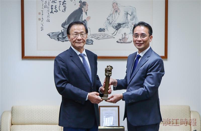 GS. TS. Huan-chao Keh, Hiệu trưởng Đại học Tamkang tặng quà lưu niệm GS. TS. Chử Đức Trình, Hiệu trưởng Trường Đại học Công nghệ, ĐHQGHN trong buổi làm việc với Hội đồng trường và Ban giám hiệu Đại học Tamkang (Nguồn ảnh: TKU Times).