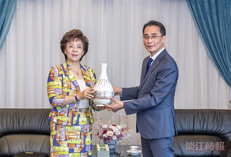 GS. TS. Flora Chia-I Chang, Chủ tịch Hội đồng trường Đại học Tamkang tặng quà lưu niệm GS. TS. Chử Đức Trình, Hiệu trưởng Trường Đại học Công nghệ, ĐHQGHN trong buổi làm việc với Hội đồng trường và Ban giám hiệu Đại học Tamkang (Nguồn ảnh: TKU Times).