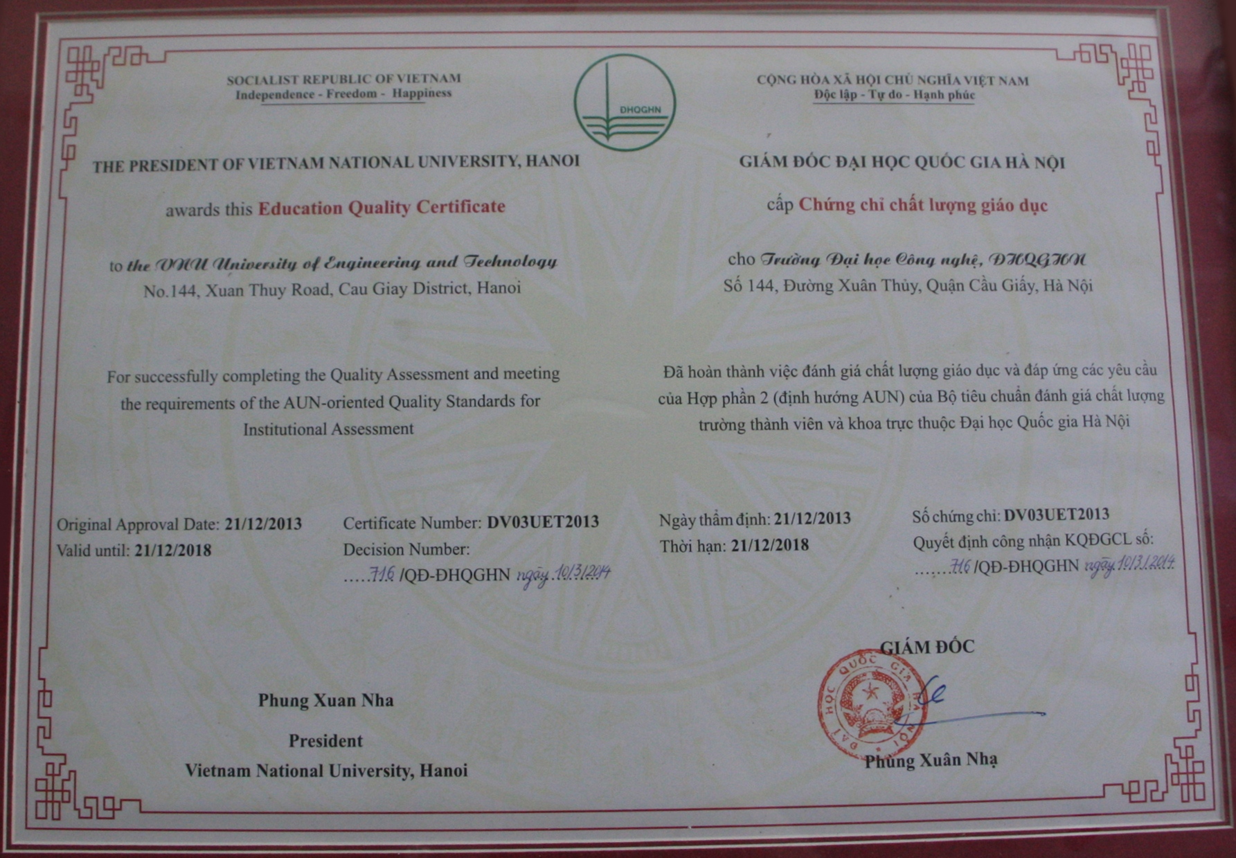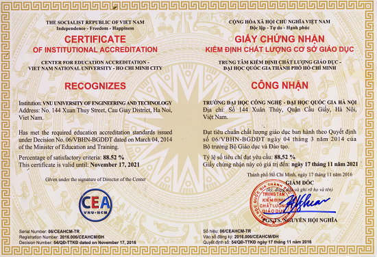 3. Thông tin về kết quả kiểm định chất lượng giáo dục: Trường Đại học Công nghệ đã được đánh giá và cấp chứng chỉ chất lượng giáo dục theo Bộ tiêu chuẩn đánh giá chất lượng trường thành viên và Khoa trực thuộc ĐHQGHN tháng 12/2013.
