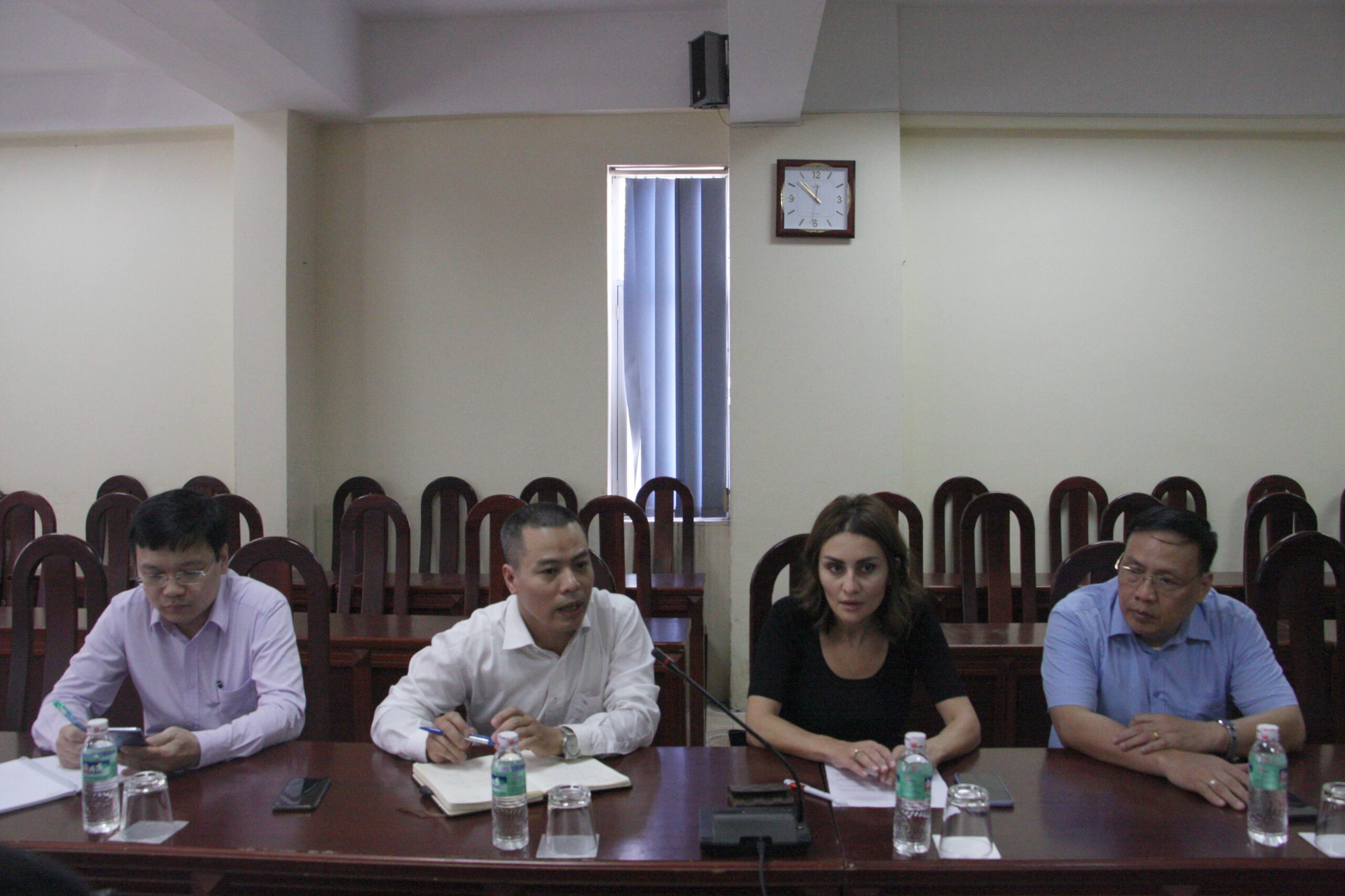 Bà Olga Pogosian (thứ hai, bên phải ảnh sang) làm việc tại Trường ĐHCN về việc đẩy mạnh đề tài nghiên cứu giữa hai bên
