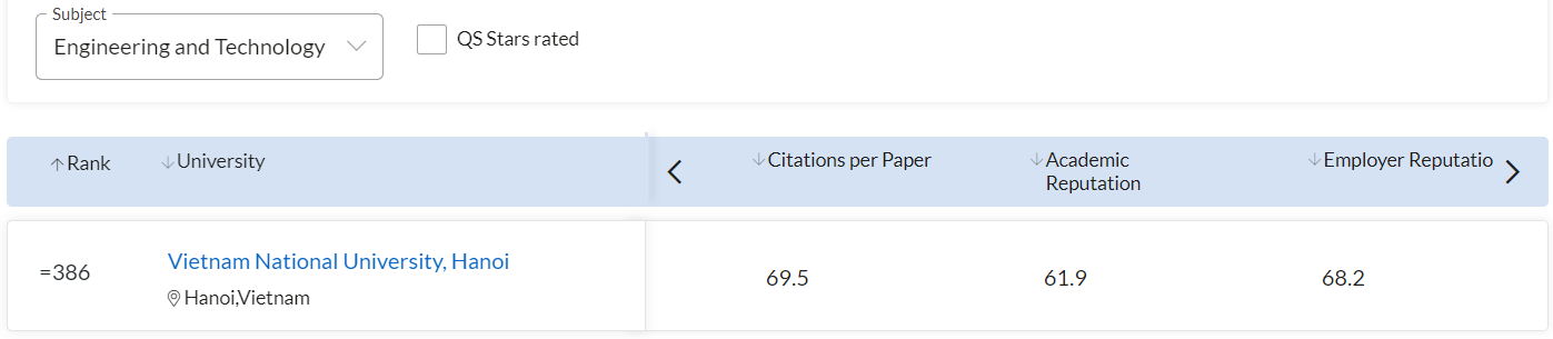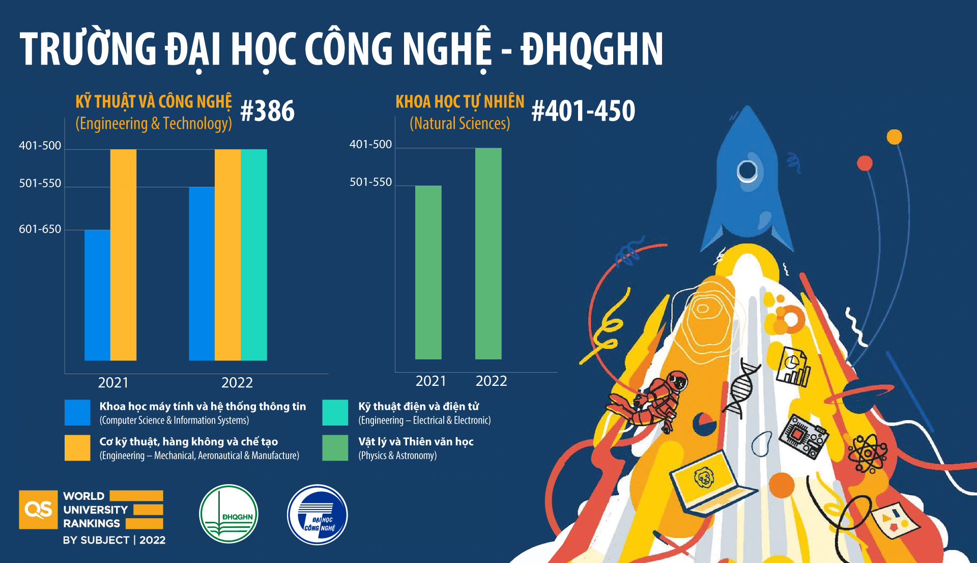 Ngày 06/04/2022, tổ chức giáo dục Quacquarelli Symonds (QS) công bố kết quả xếp hạng 51 lĩnh vực thuộc 5 nhóm lĩnh vực của 1543 cơ sở giáo dục đại học thế giới, với khoảng 14000 chương trình đào tạo. Trong đó, Trường Đại học Công nghệ – Đại học Quốc gia Hà Nội có các chương trình đào tạo thuộc 4 lĩnh vực được xếp ở vị trí từ 400 đến 600 tốt nhất thế giới. Đặc biệt, năm 2022 là năm đầu tiên lĩnh vực Kỹ thuật điện và điện tử được xếp hạng, với thứ hạng 451-500.