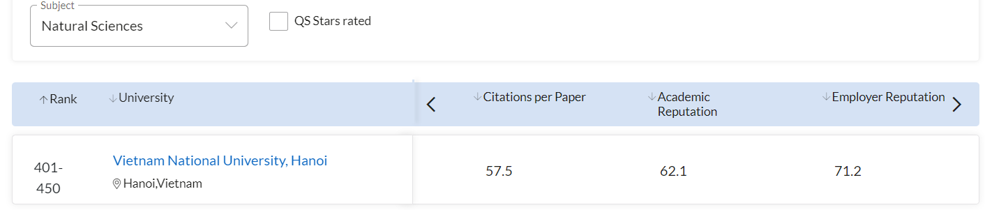 Ngoài ĐHQGHN, nhóm lĩnh vực Kỹ thuật và Công nghệ có 4 cơ sở giáo dục đại học khác tại Việt Nam được xếp hạng, bao gồm: Trường Đại học Bách Khoa Hà Nội, Đại học Quốc gia Thành phố Hồ Chí Minh, Trường Đại học Duy Tân và Trường Đại học Tôn Đức Thắng. Trong nhóm lĩnh vực Khoa học Tự nhiên, Trường Đại học Công nghệ cũng là một trong những đơn vị đóng góp vào việc gia tăng thứ hạng của lĩnh vực Vật lý và Thiên văn học trong ĐHQGHN. Lĩnh vực này trong nhóm 451-500 thế giới và được xếp vị trí thứ nhất Việt Nam.