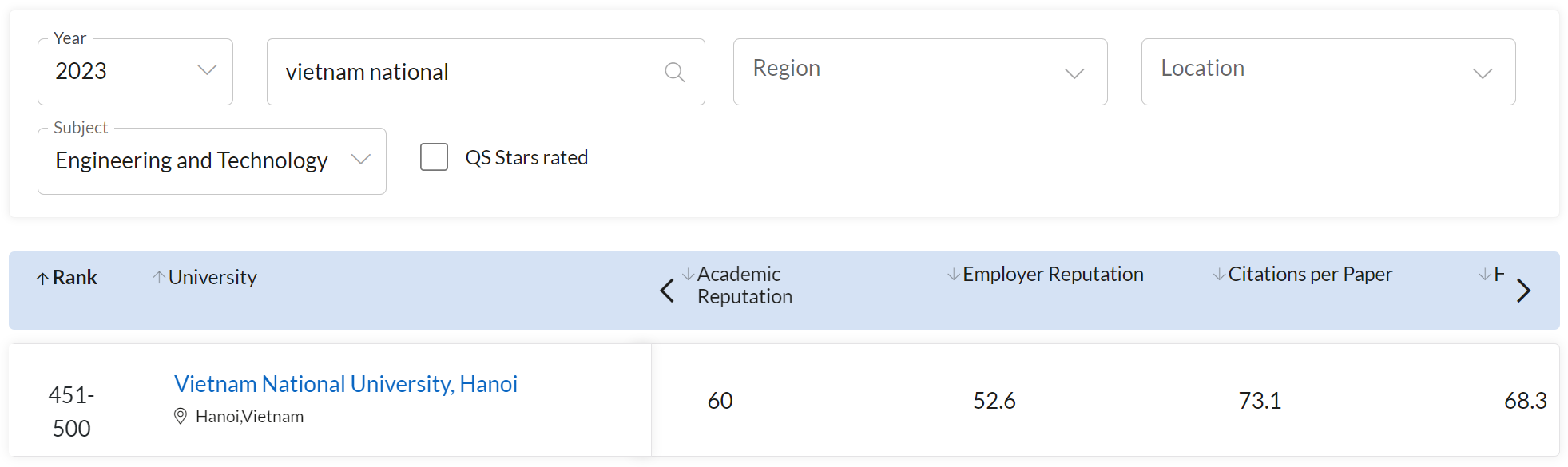 Trong Bảng xếp hạng QS thế giới theo lĩnh vực năm 2023 (QS WUR by subject 2023), Trường Đại học Công nghệ – Đại học Quốc gia Hà Nội tiếp tục duy trì vị thế tại các lĩnh vực mũi nhọn với 4/6 lĩnh vực của ĐHQGHN được xếp hạng so với năm 2022, gồm lĩnh vực Khoa học máy tính và hệ thống thông tin (Computer Science & Information Systems); Cơ kỹ thuật, hàng không và chế tạo (Engineering – Mechanical, Aeronautical & Manufacture); Kỹ thuật điện và điện tử (Engineering – Electrical & Electronic); Vật lý và Thiên văn học (Physics & Astronomy).