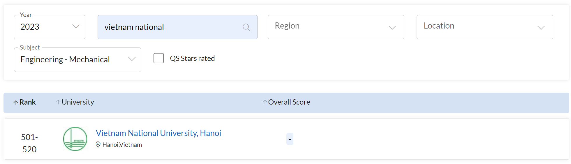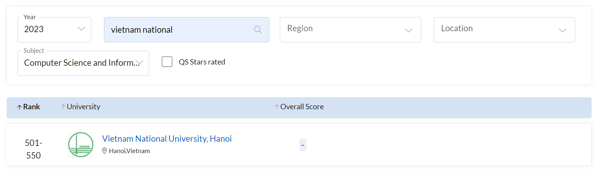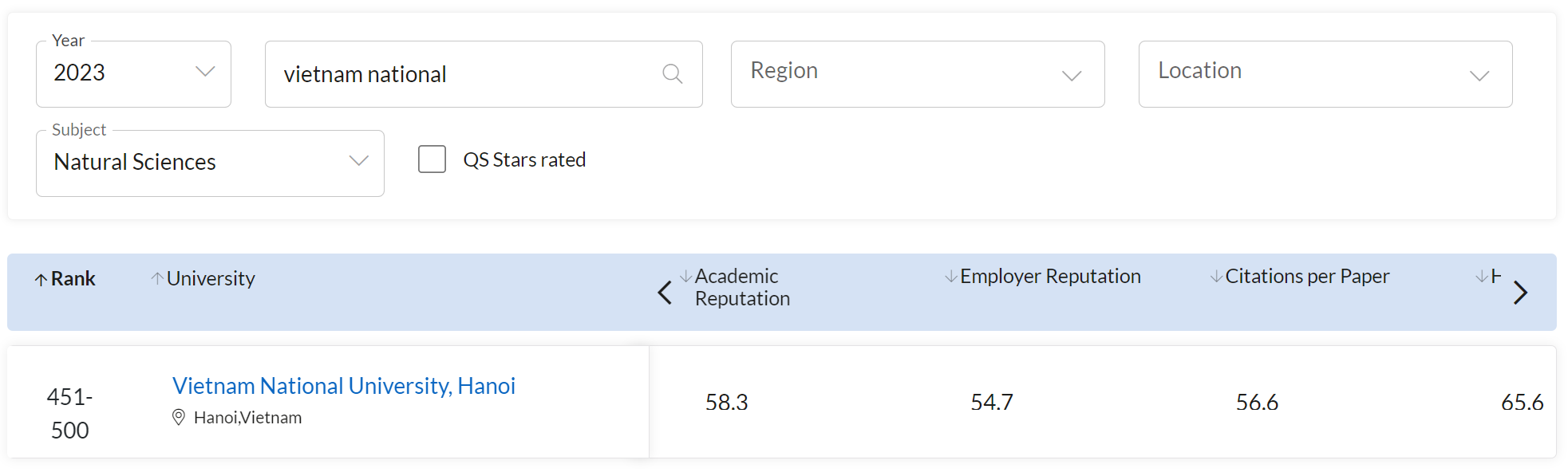 | Xếp hạng QS WUR theo lĩnh vực và nhóm lĩnh vực | 2022 | 2023 |