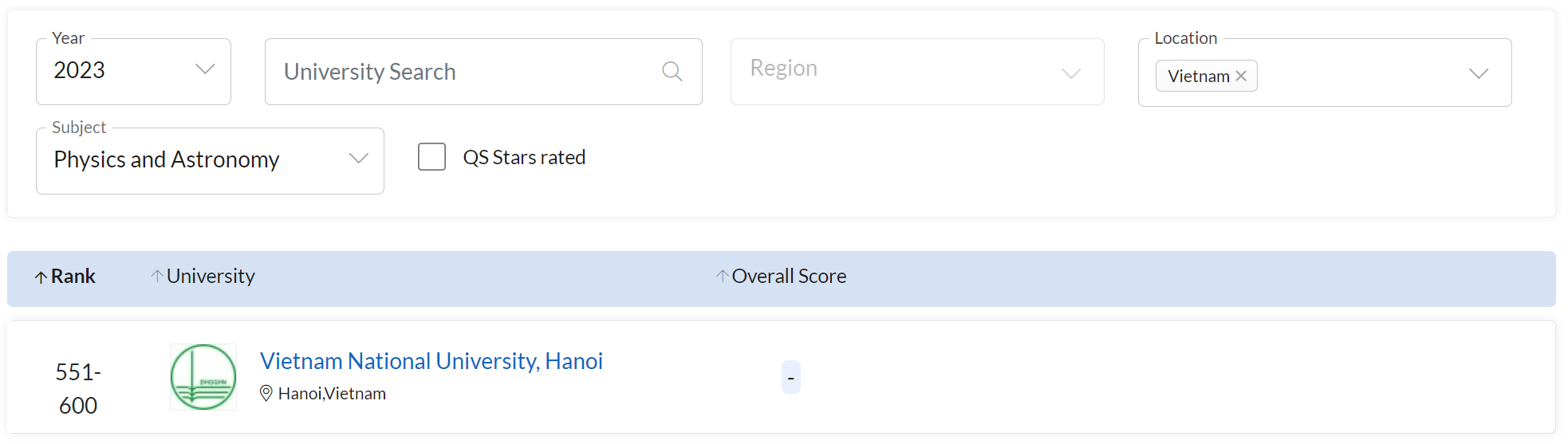 Lĩnh vực Vật lý và Thiên văn học – xếp hạng 551-600 thế giới