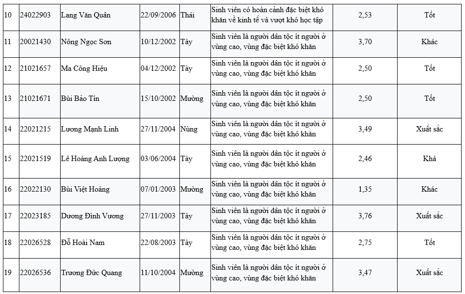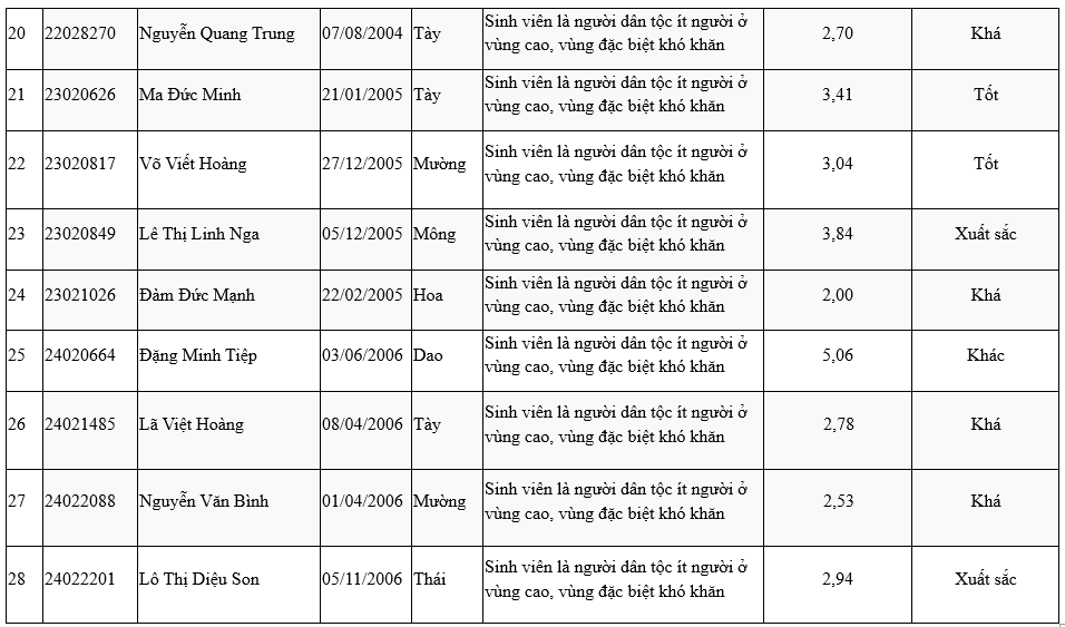 | 3 | 23020748 | Lục Văn Khoa | 12/02/2005 | Nùng | Sinh viên là người dân tộc ít người ở vùng cao, vùng đặc biệt khó khăn | 2,20 | Khá |
