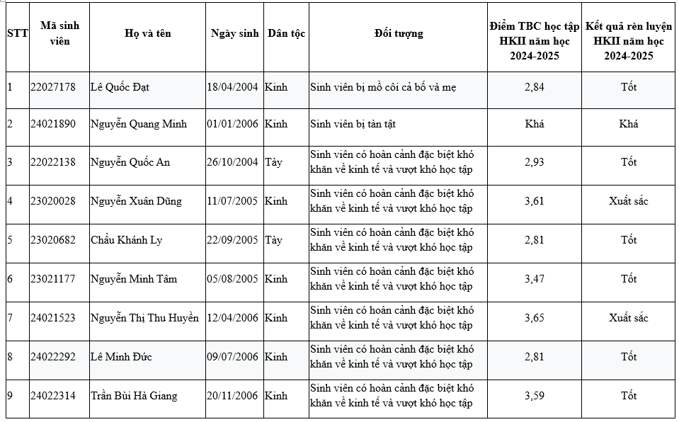 | 3 | 25021860 | Nguyễn Đức Lương | 04/09/2007 | Kinh | Sinh viên có hoàn cảnh đặc biệt khó khăn về kinh tế và vượt khó học tập | Xuất sắc | Không đúng đối tượng xét | |