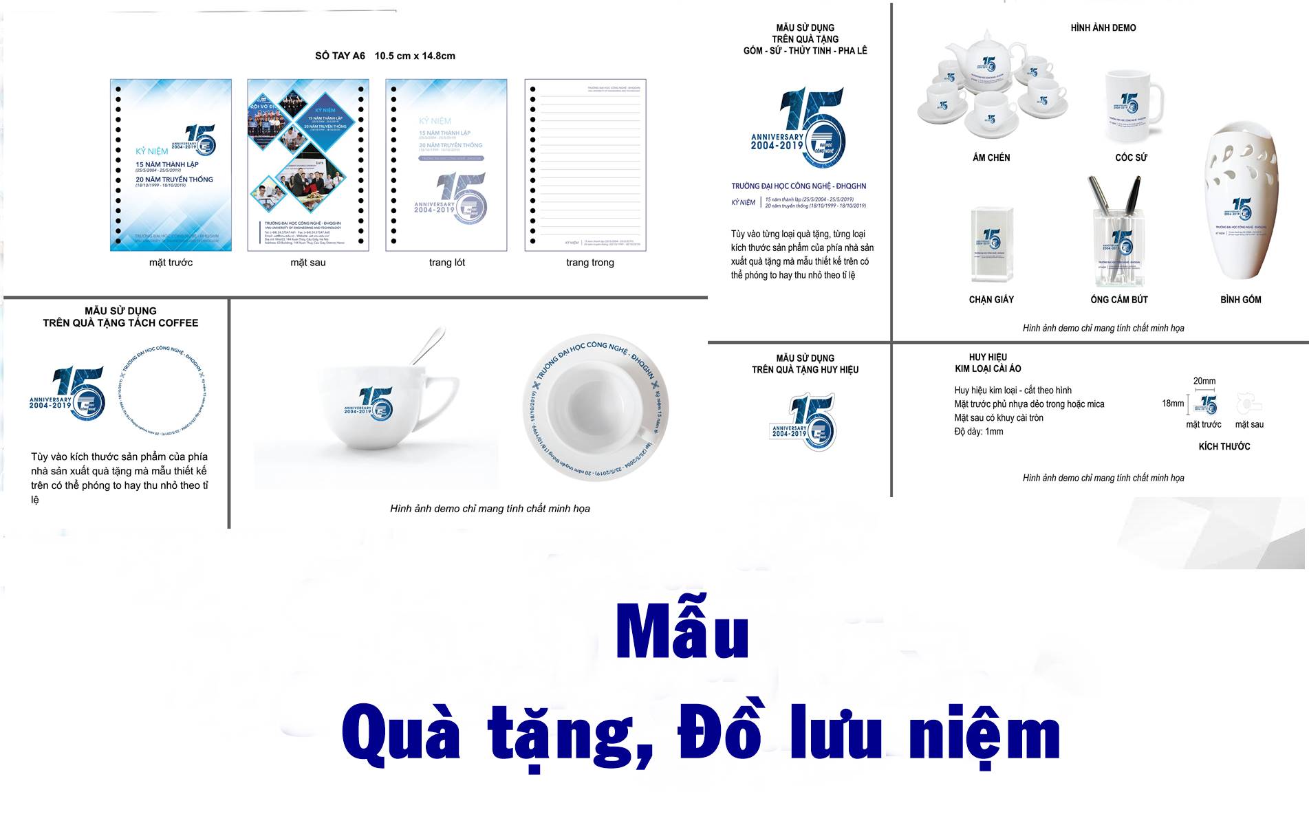 Nhân dịp kỉ niệm 15 năm thành lập (2004-2019) và 20 năm ngày truyền thống (1999-2019), Trường Đại học Công nghệ công bố các mẫu quà tặng sử dụng trong các hoạt động của Nhà trường. 1. Túi giấy …