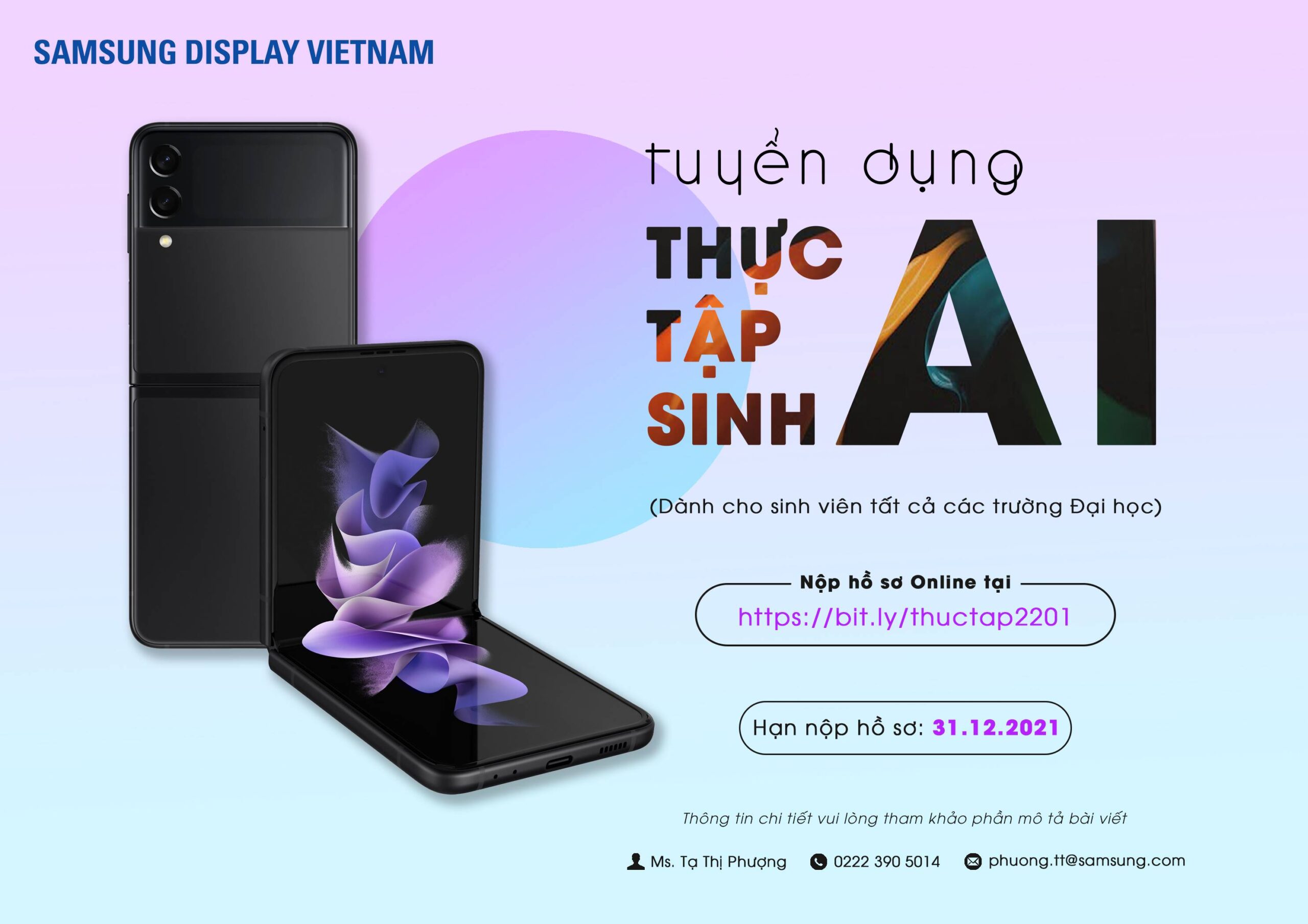 Phòng Công tác sinh viên xin trân trọng gửi thông tin đến các bạn sinh viên về chương trình thực tập sinh lần thứ nhất của Công ty Samsung Display Việt Nam (SDV) năm 2022: 1. Chương trình Thực tập sinh Kỹ …