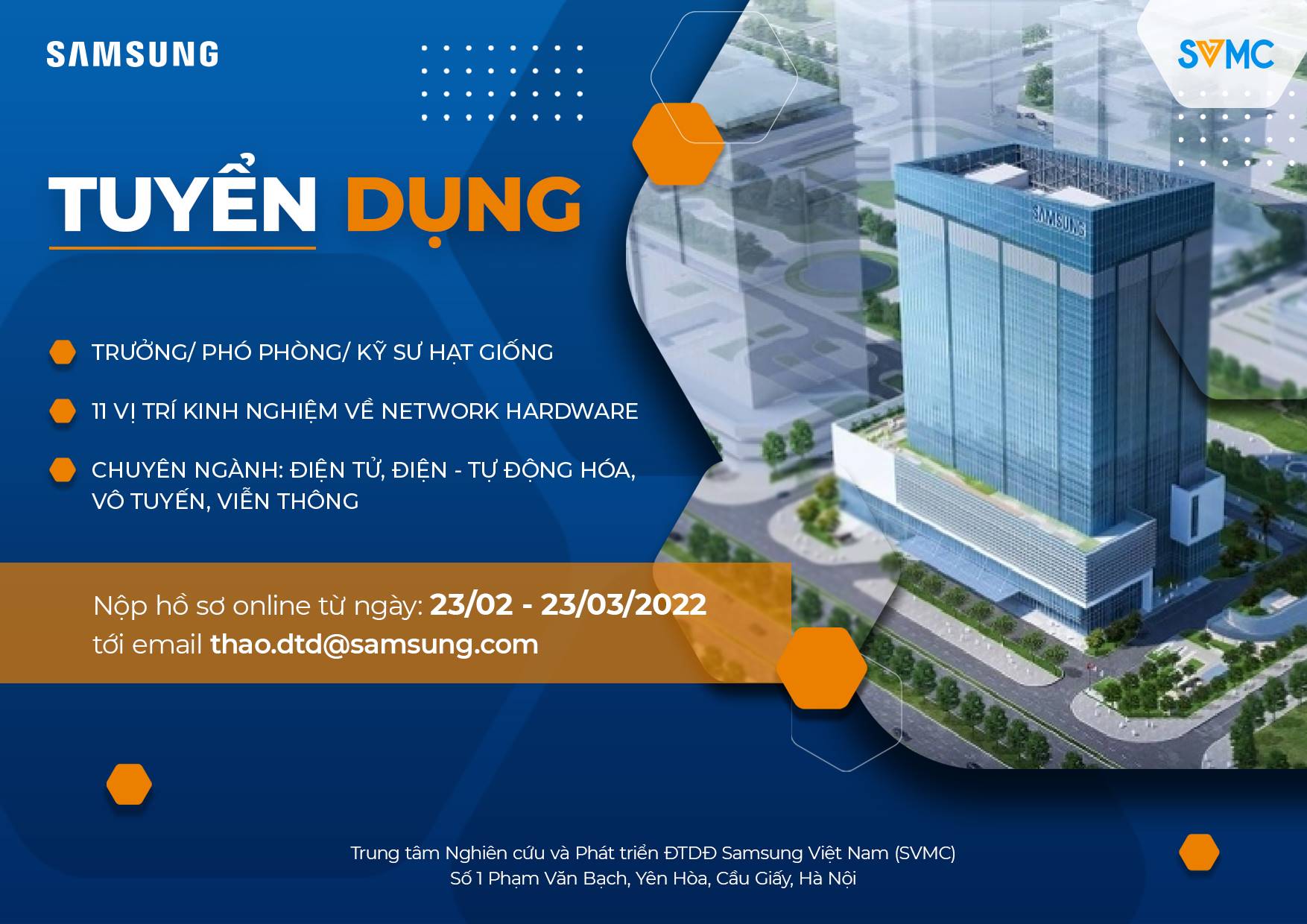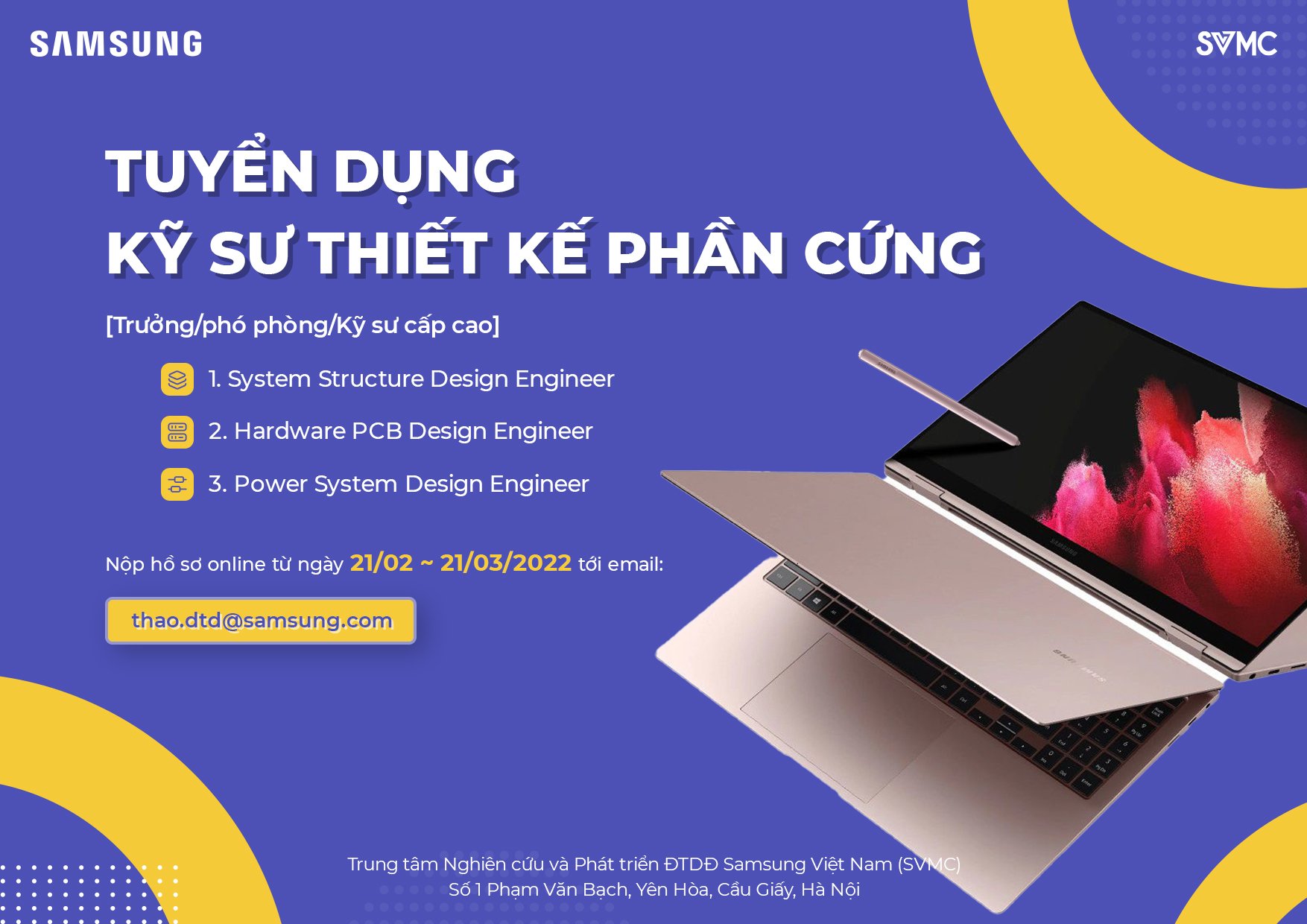 Để đáp ứng chiến lược mở rộng, Trung tâm Nghiên cứu và Phát triển ĐTDĐ Samsung Việt Nam (SVMC) đang có nhu cầu tuyển dụng vị trí Kỹ sư cơ khí (mảng New Computing). Quý Thầy Cô vui lòng …