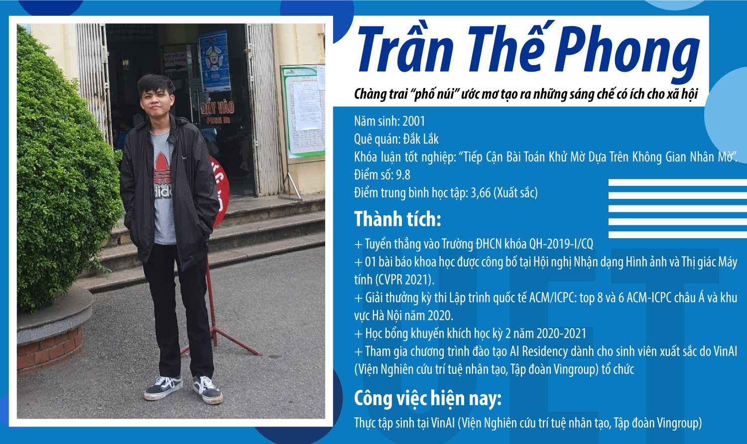 Vào năm 2019, từ một cậu học trò nhỏ với niềm đam mê và đạt nhiều giải thưởng tại các kỳ thi Tin học, Trần Thế Phong đã trở thành niềm tự hào của tỉnh Đắk Lắk khi được tuyển thẳng và trở thành sinh viên khóa QH-2019 của Trường Đại học Công nghệ (Đại học Quốc gia Hà Nội). Sau 3 năm học tập dưới mái trường Công nghệ, Thế Phong đã tốt nghiệp trước thời hạn 1 năm với bằng tốt nghiệp Xuất sắc và được khen thưởng “Bảo vệ khóa luận/đồ án tốt nghiệp đạt kết quả Xuất sắc”. Khi nhắc đến “cơ duyên” với Trường ĐHCN, Thế Phong khẳng định: “Chính niềm đam mê với Tin học đã giúp em được tiếp xúc, trải nghiệm môi trường của Nhà trường ngay từ những năm cấp ba. Và sau những tháng tập huấn khi tham gia kỳ thi Olympic Tin học tại trường em tin rằng đây là nơi em có thể gửi gắm tương lai. Các thành công hiện tại cũng như trải nghiệm trong ba năm vừa qua đã khẳng định lựa chọn của em hoàn toàn chính xác. Em hiện tại và em của ba năm trước là hai con người hoàn toàn khác nhau. Đến nay, em đã tích lũy thêm được vô số kiến thức cũng như kinh nghiệm. Ngoài ra, em cũng tự cảm thấy mình không còn nhút nhát như ba năm về trước. Những thay đổi này sẽ là tiền đề để em có thể tiến xa hơn trong tương lai”.