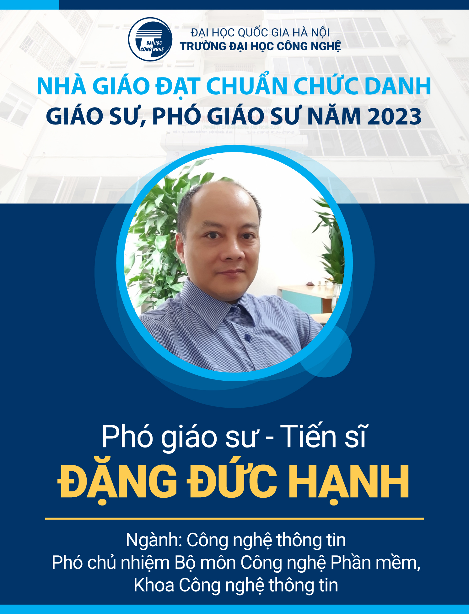 Tân Phó Giáo sư Đặng Đức Hạnh (Khoa Công nghệ thông tin) tốt nghiệp tiến sĩ ngành Công nghệ thông tin tại Trường Đại học Tổng hợp Bremen, CHLB Đức. Các hướng nghiên cứu chính tập trung vào Tự động hóa kỹ nghệ phần mềm; Kỹ nghệ mô hình phần mềm; Đảm bảo chất lượng phần mềm; Các phương pháp hình thức.