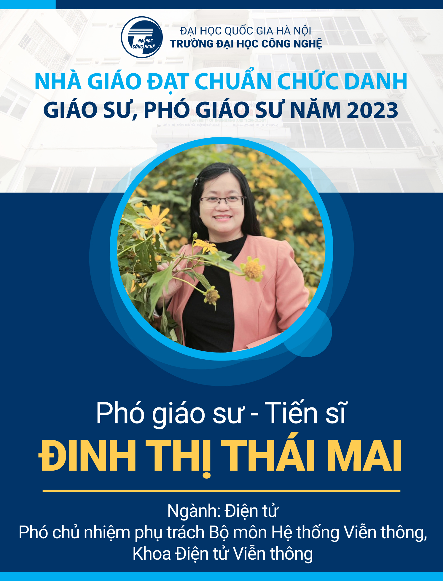 Tân Phó Giáo sư Đinh Thị Thái Mai (Khoa Điện tử viễn thông) tốt nghiệp tiến sĩ ngành Công nghệ Kỹ thuật Điện tử, Truyền thông tại Trường Đại học Công Nghệ, Đại học Quốc Gia Hà Nội. Các hướng nghiên cứu chủ yếu là truyền thông không dây trong mạng truyền thông thế hệ mới; ứng dụng định vị tìm đường đi trong Hệ thống mạng 5G/IoT; an ninh trong Mạng truyền thông.