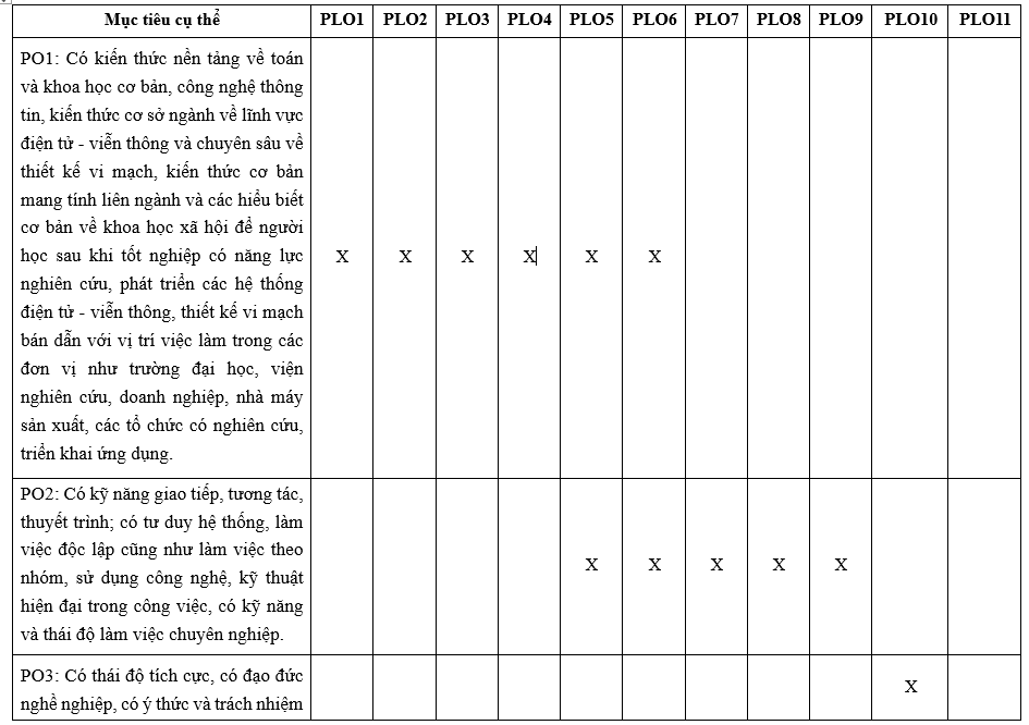 PLO 6: Thể hiện (3) kỹ năng về kỹ thuật điện tử, kỹ thuật đo lường để kiểm chứng, tổng hợp logic, thiết kế vật lý, kiểm tra đo đạc và đánh giá các chỉ tiêu kỹ thuật của khối vi mạch bán dẫn; phân tích và giải thích dữ liệu một cách khoa học, đưa ra các kết luận đáng tin cậy và phù hợp thực tiễn.