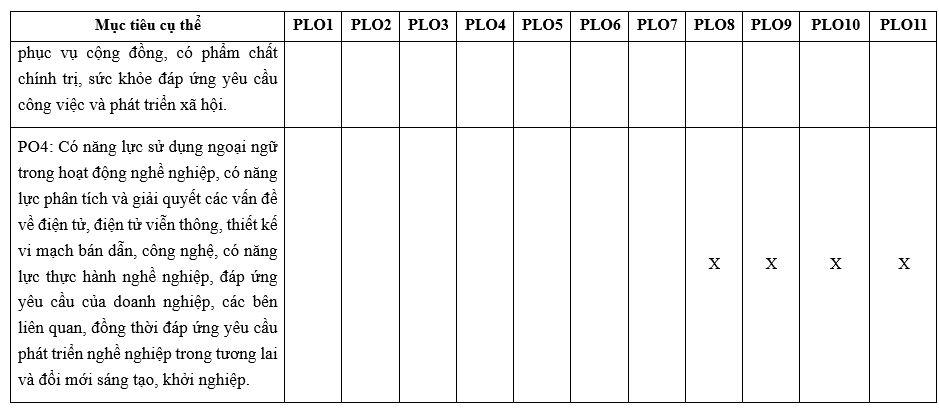 PLO 11: Đáp ứng sự (3) phát triển nhanh chóng của công nghệ kỹ thuật điện tử – viễn thông, vi mạch bán dẫn bằng cách vận dụng các chiến lược học tập phù hợp, bảo đảm khả năng học tập suốt đời. Có ý thức về đổi mới sáng tạo, đóng góp tạo ra những sản phẩm có giá trị phục vụ cộng đồng và phát triển lĩnh vực chuyên môn.